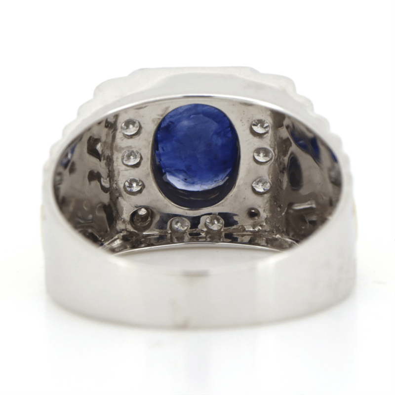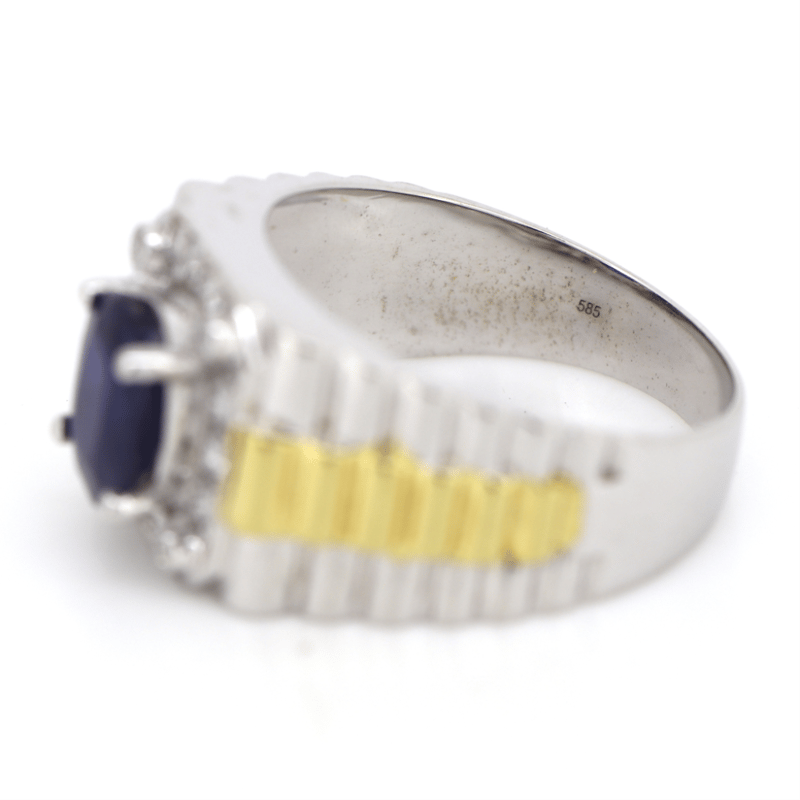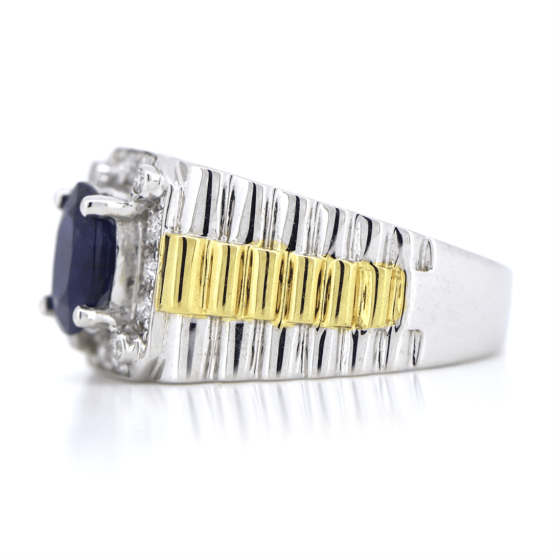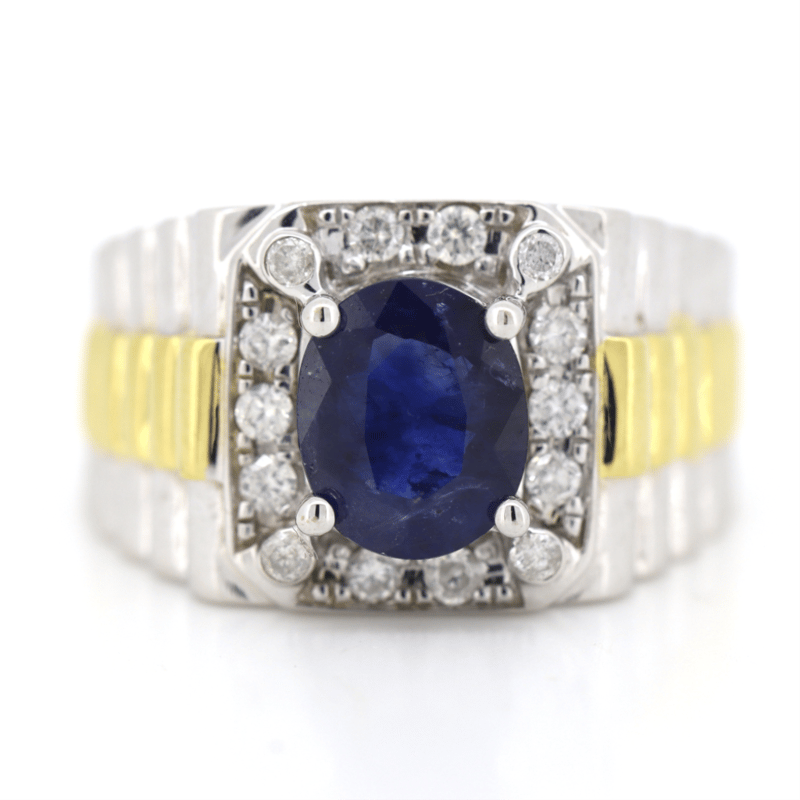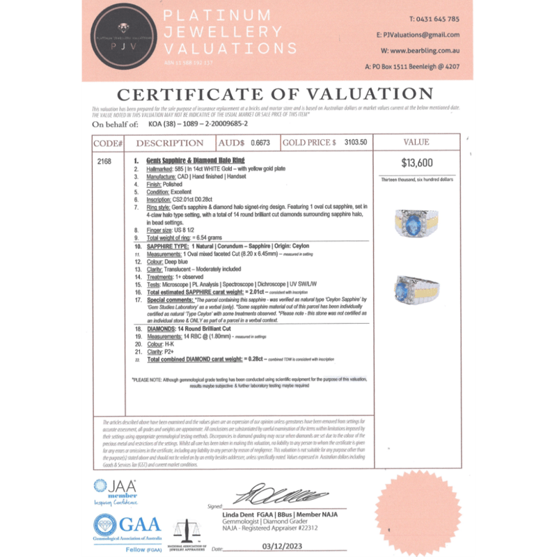 14K WHITE/YELLOW GOLD, 2.01CT BLUE CEYLON SAPPHIRE AND DIAMOND, GENTS RING. The Centre Features, One Oval Cut, Deep Blue, Ceylon Sapphire (2.01Ct, Moderately Included), 4 Claw Set. Encompassing The Design Are, 14 Round Brilliant Cut, Diamonds (0.28Ct Tdw, H-K Colour, P2+ Clarity), Bead Set. Ring Size Q. Jewellery Valuations Provided By A Third Party Professional Not Directly Associated With Lloyds Auctions at AUD $$13,600.00This Insurance Valuation has been provided by a registered Jewellery Valuer and is intended for insurance purposes only. The valuation amount has no bearing on the auction value of the item. Any questions regarding the valuation should be directed to the issuing Valuer (refer to contact details on the certificate) as Lloyds have no association or relationship with the Valuer or the valuation amount contained within the valuation. Condition: NEW 0645882+12