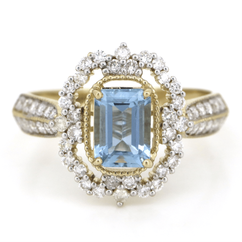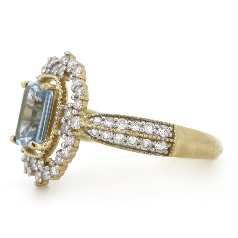 The Centre Features, One Emerald Cut, Santa Maria Blue, Aquamarine (0.91Ct, Light Natural Inclusions), 4 Claw Set. Decorating The Setting And The Band Are, 56 Round Brilliant Cut, Diamonds (0.53Ct Tdw, G-J Colour, Si-I2 Clarity), Claw/Bead Set With Millegrain Detail. Ring Size M.