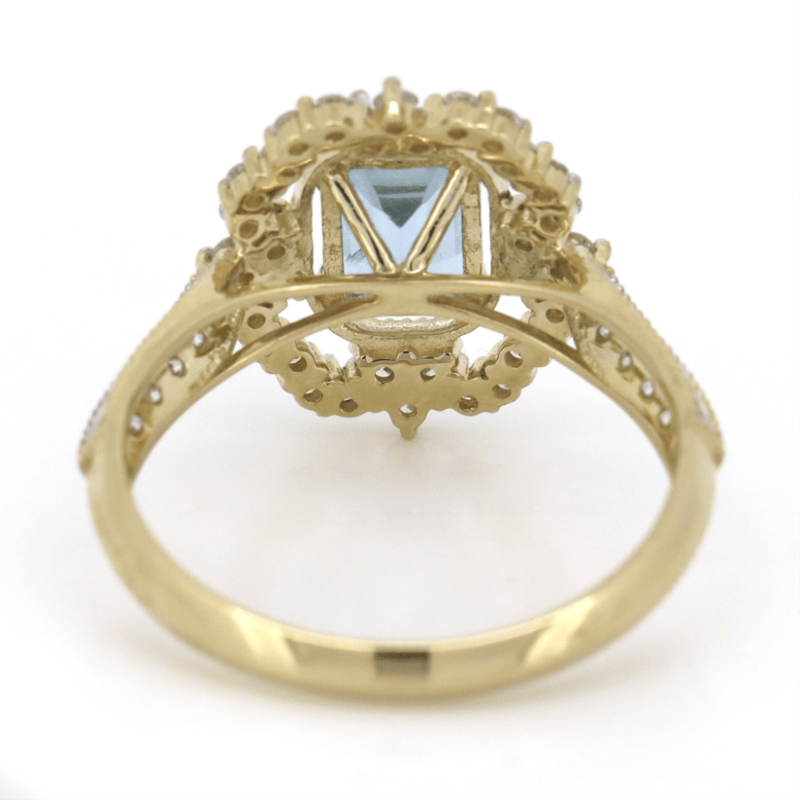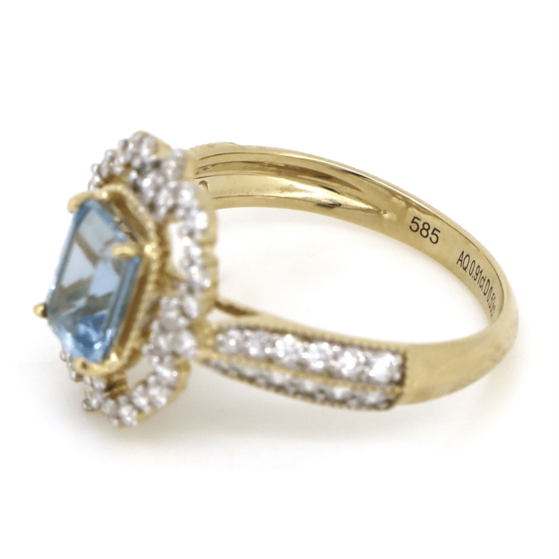 14K YELLOW GOLD, AQUAMARINE AND DIAMOND, RING.