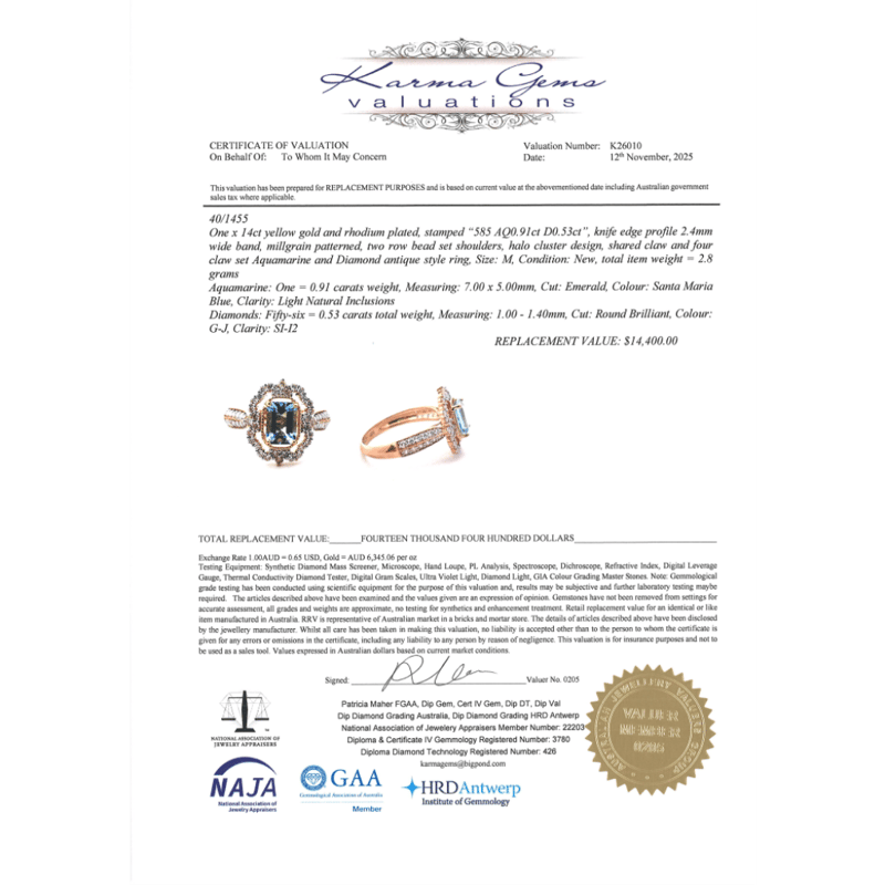 This Insurance Valuation has been provided by a registered Jewellery Valuer and is intended for insurance purposes only. The valuation amount has no bearing on the auction value of the item. Any questions regarding the valuation should be directed to the issuing Valuer (refer to contact details on the certificate) as Lloyds have no association or relationship with the Valuer or the valuation amount contained within the valuation.