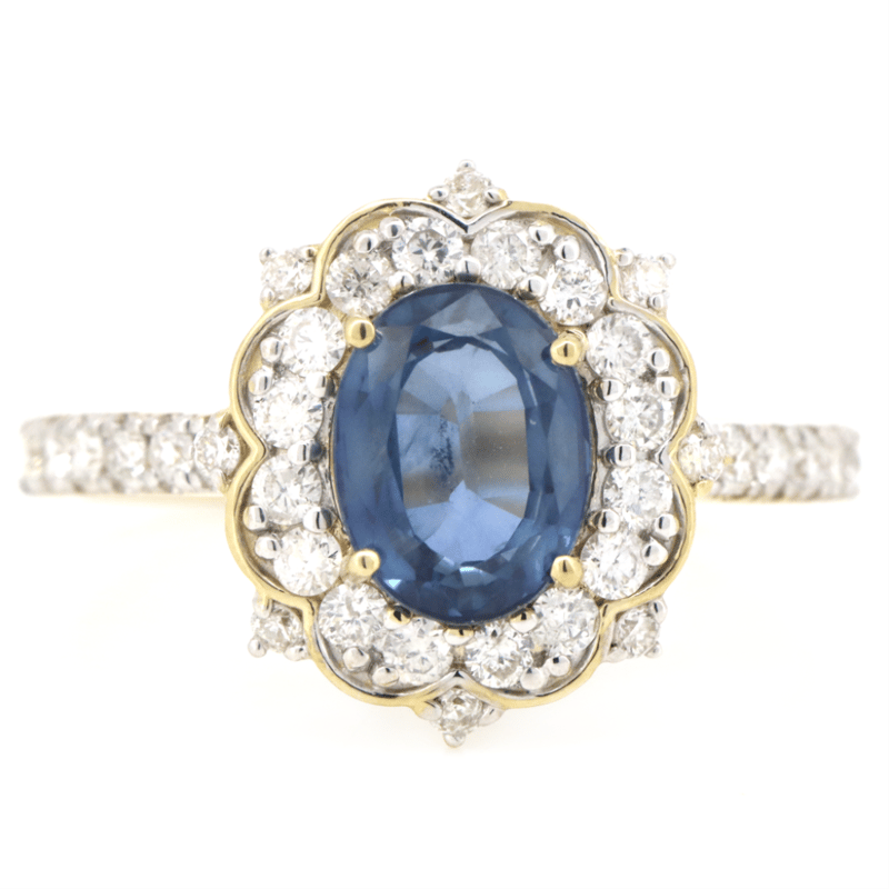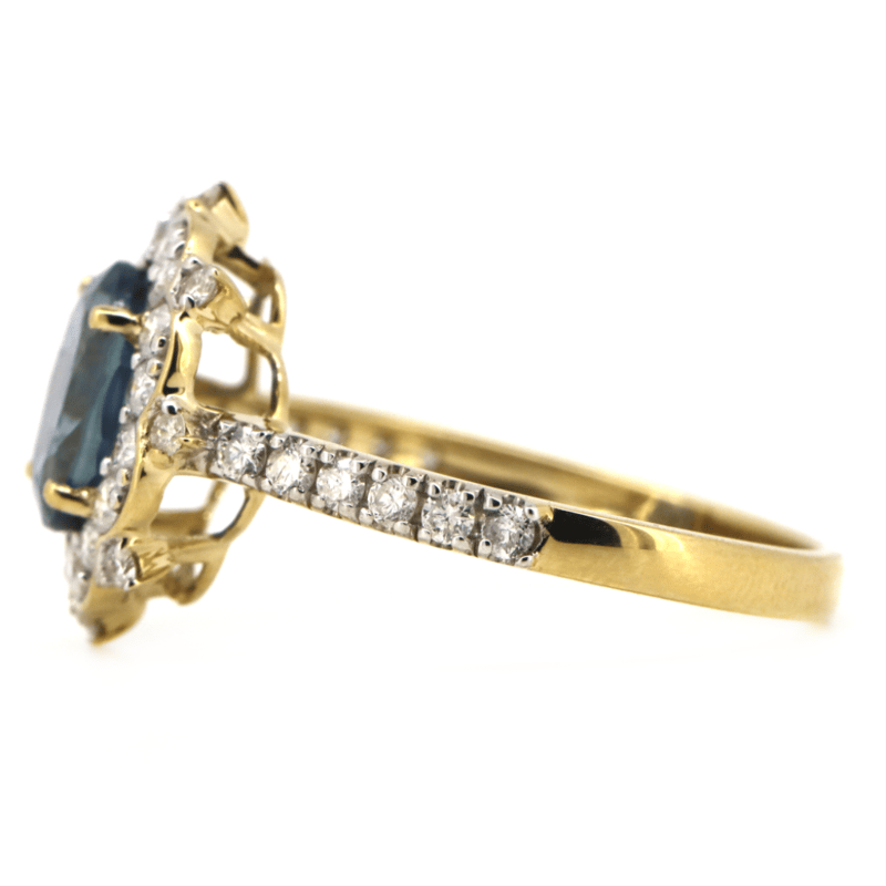 14K YELLOW GOLD, 1.77CT CEYLON SAPPHIRE AND DIAMOND, HALO RING.
