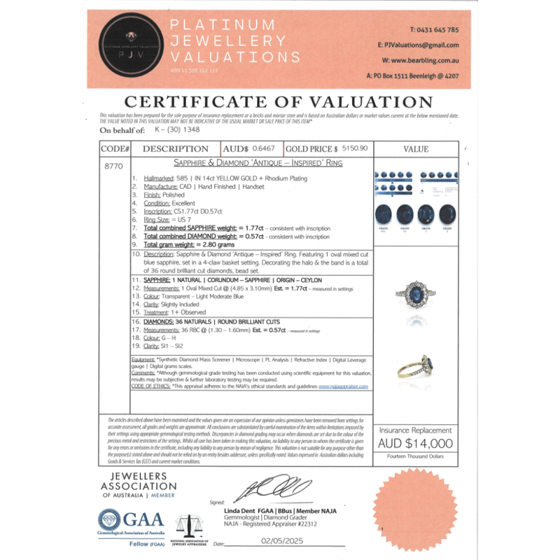 This Insurance Valuation has been provided by a registered Jewellery Valuer and is intended for insurance purposes only. The valuation amount has no bearing on the auction value of the item. Any questions regarding the valuation should be directed to the issuing Valuer (refer to contact details on the certificate) as Lloyds have no association or relationship with the Valuer or the valuation amount contained within the valuation.