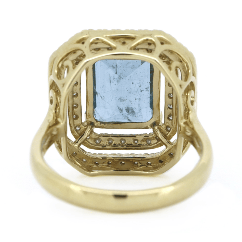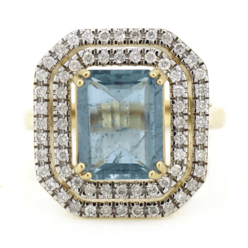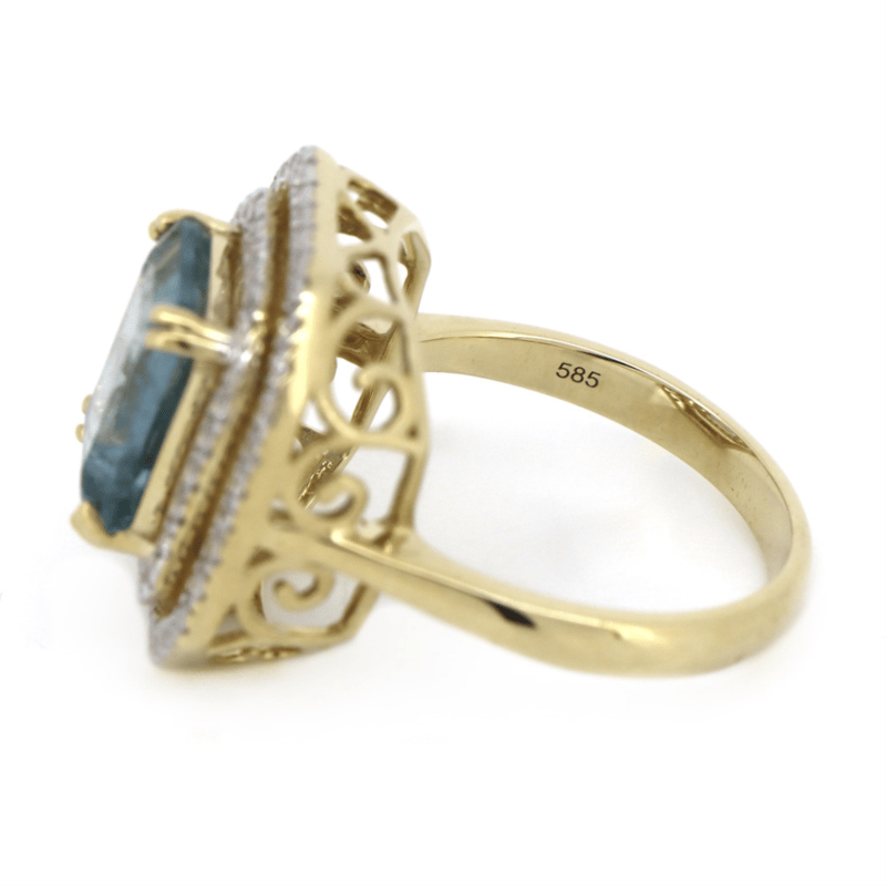 14K YELLOW GOLD, AQUAMARINE AND DIAMOND, DOUBLE HALO RING.