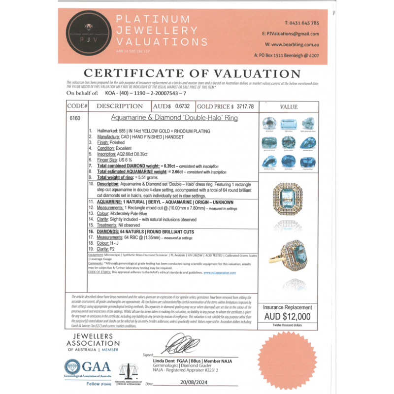 This Insurance Valuation has been provided by a registered Jewellery Valuer and is intended for insurance purposes only. The valuation amount has no bearing on the auction value of the item. Any questions regarding the valuation should be directed to the issuing Valuer (refer to contact details on the certificate) as Lloyds have no association or relationship with the Valuer or the valuation amount contained within the valuation.