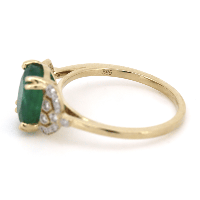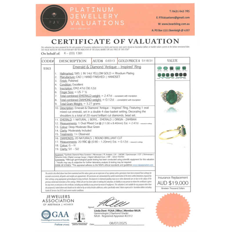 14K YELLOW GOLD, 2.47CT ZAMBIAN EMERALD AND DIAMOND, RING. The Centre Features, One Oval Mixed Cut, Deep Moderate Blue Green, Zambian Emerald (2.47Ct, Moderately Included), Double 4 Claw Basket Set. Decorating The Shoulders Are, 20 Round Brilliant Cut, Diamonds (0.12Ct Tdw, G-H Colour, Si1-Si2 Clarity), Bead Set. Ring Size O. Jewellery Valuations Provided By A Third Party Professional Not Directly Associated With Lloyds Auctions at AUD $$19,000.00This Insurance Valuation has been provided by a registered Jewellery Valuer and is intended for insurance purposes only. The valuation amount has no bearing on the auction value of the item. Any questions regarding the valuation should be directed to the issuing Valuer (refer to contact details on the certificate) as Lloyds have no association or relationship with the Valuer or the valuation amount contained within the valuation. Condition: NEW 0645882+74