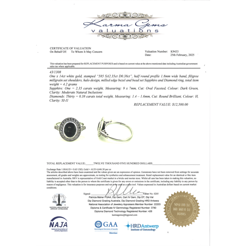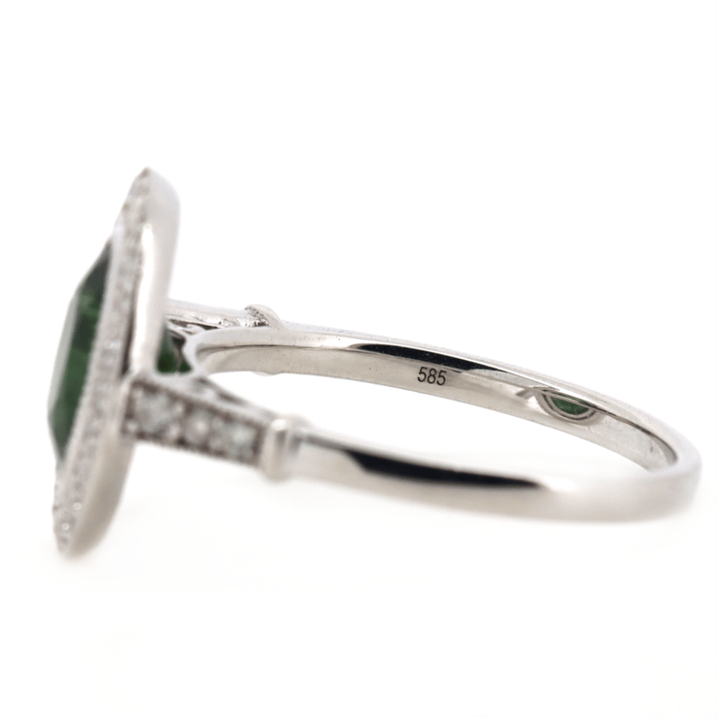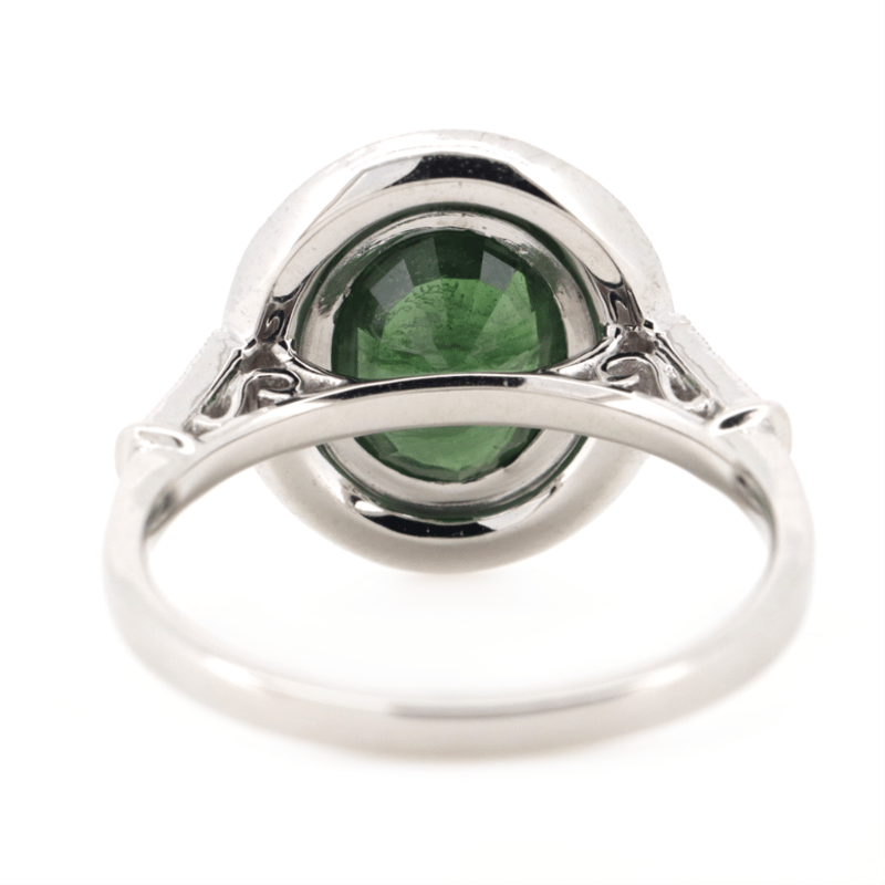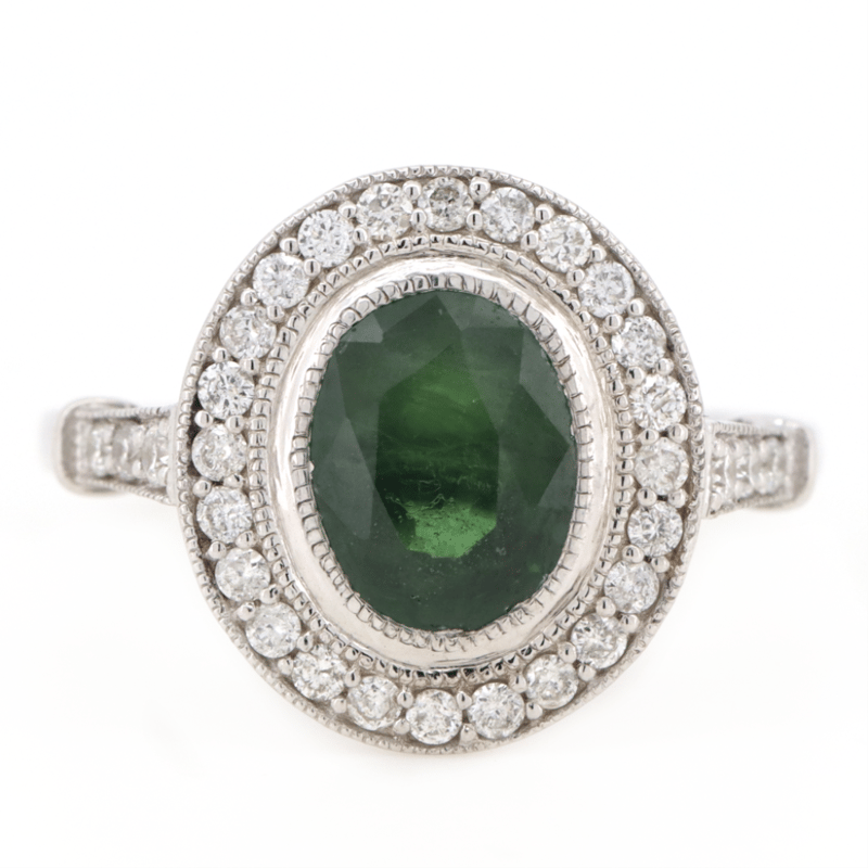 14K WHITE GOLD, GREEN SAPPHIRE AND DIAMOND, HALO RING. The Centre Features, One Oval Cut, Green, Sapphire (2.35Ct, Moderate Eye Visible Inclusions), Bezel Set With Millegrain Detail. Surrounding The Centre In A Halo And Decorating The Shoulders Are, 30 Round Brilliant Cut, Diamonds (0.38Ct Tdw, H Colour, Si-I1 Clarity), Bead Set With Millegrain Detail. Ring Size M. Jewellery Valuations Provided By A Third Party Professional Not Directly Associated With Lloyds Auctions at AUD $$12,500.00This Insurance Valuation has been provided by a registered Jewellery Valuer and is intended for insurance purposes only. The valuation amount has no bearing on the auction value of the item. Any questions regarding the valuation should be directed to the issuing Valuer (refer to contact details on the certificate) as Lloyds have no association or relationship with the Valuer or the valuation amount contained within the valuation. Condition: NEW 0645882+75