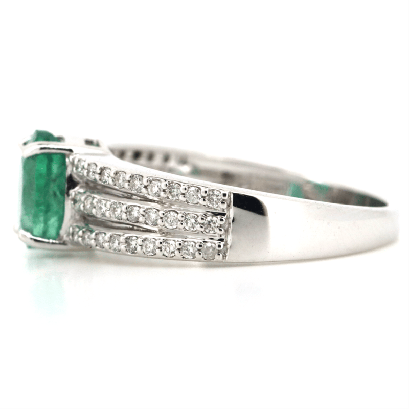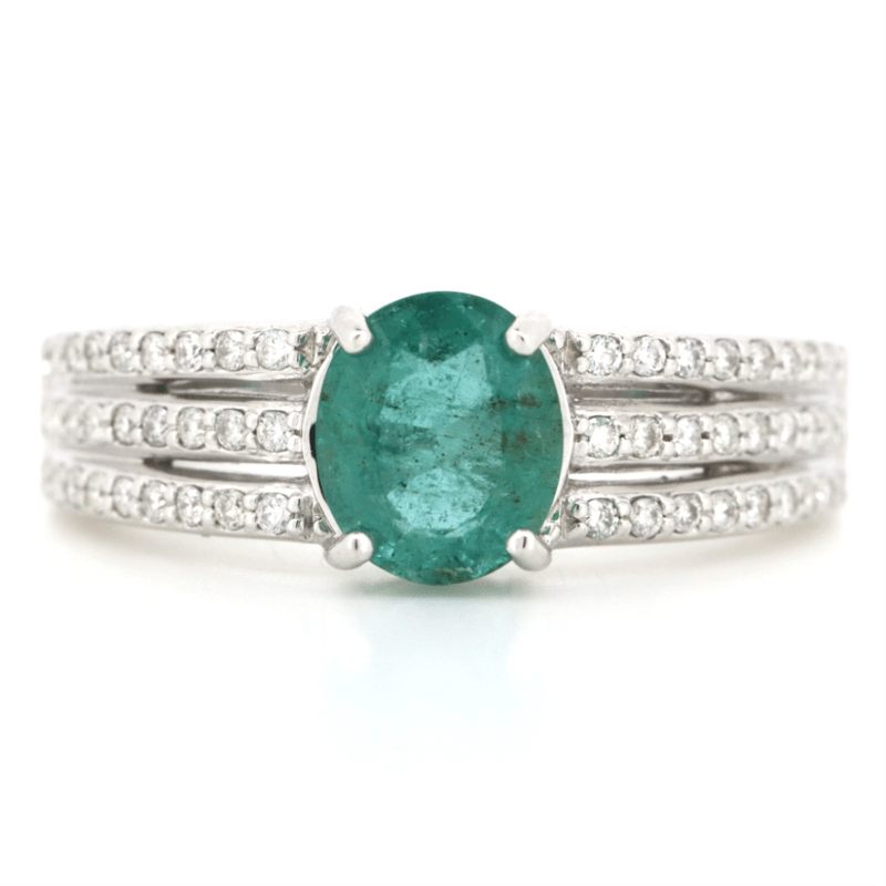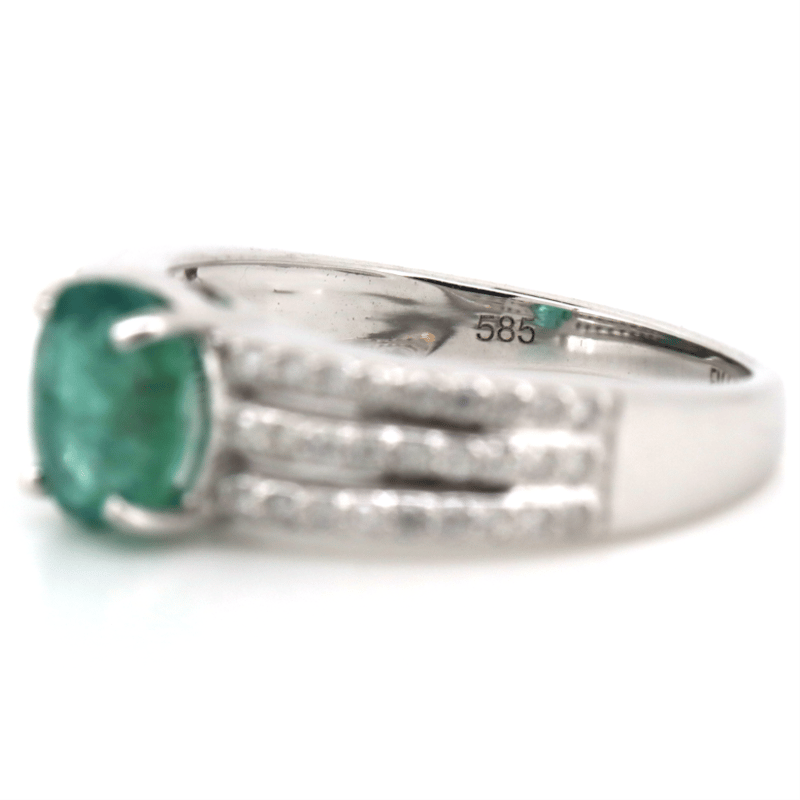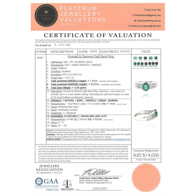 14K WHITE GOLD, EMERALD AND DIAMOND, DRESS RING. The Centre Features, One Oval Cut, Moderate Blue Green, Emerald (1.41Ct, Moderately Included, Enhanced), 4 Claw Set. Decorating The Band Are, 54 Round Brilliant Cut, Diamonds (0.21Ct Tdw, G-H Colour, Si1-Si2 Clarity), Bead Set. Ring Size M. Jewellery Valuations Provided By A Third Party Professional Not Directly Associated With Lloyds Auctions at AUD $$14,000.00This Insurance Valuation has been provided by a registered Jewellery Valuer and is intended for insurance purposes only. The valuation amount has no bearing on the auction value of the item. Any questions regarding the valuation should be directed to the issuing Valuer (refer to contact details on the certificate) as Lloyds have no association or relationship with the Valuer or the valuation amount contained within the valuation. Condition: NEW 0645882+67