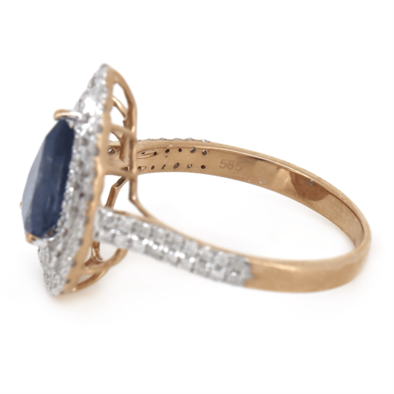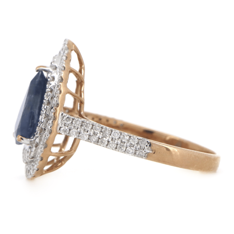 14K ROSE GOLD, BLUE SAPPHIRE AND DIAMOND, DOUBLE HALO RING.