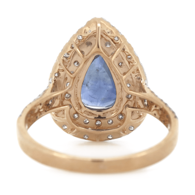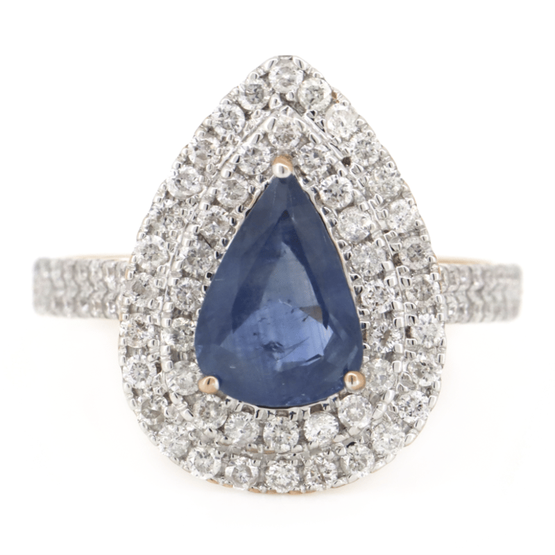 The Centre Features, One Pear Faceted, Deep Blue, Sapphire (1.54Ct, Minor Eye Visible Inclusions), 3 Claw Set. Surrounding The Centre In A Halo And Decorating The Band Are, 84 Round Brilliant Cut, Diamonds (0.63Ct Tdw, J-K Colour, Si2-I2 Clarity), Claw Set. Ring Size M.