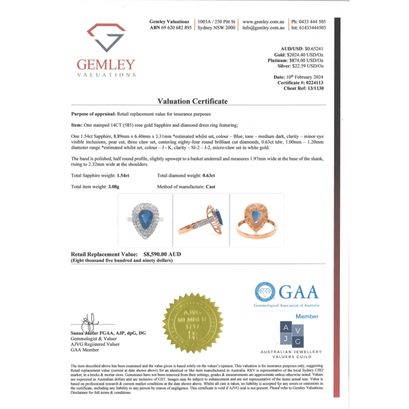 This Insurance Valuation has been provided by a registered Jewellery Valuer and is intended for insurance purposes only. The valuation amount has no bearing on the auction value of the item. Any questions regarding the valuation should be directed to the issuing Valuer (refer to contact details on the certificate) as Lloyds have no association or relationship with the Valuer or the valuation amount contained within the valuation.