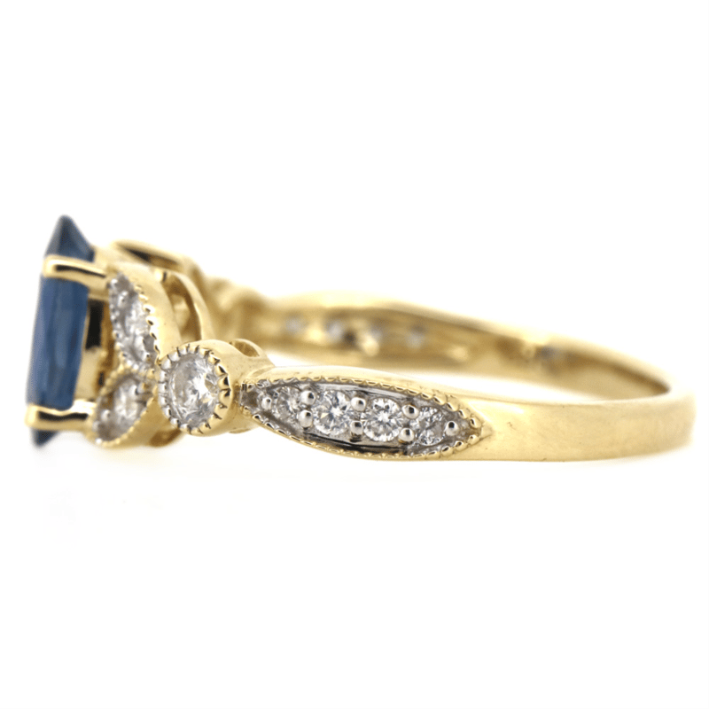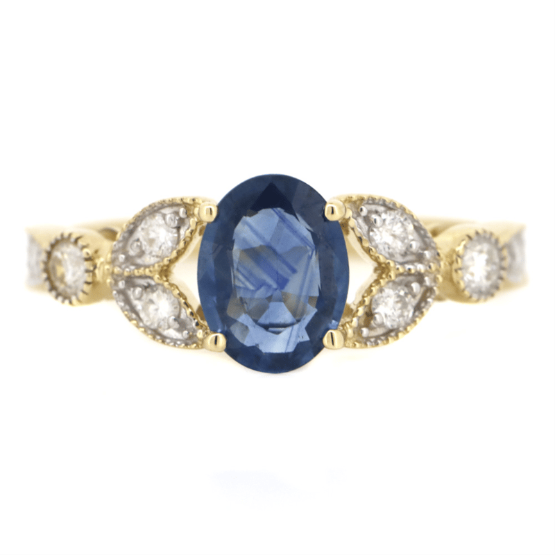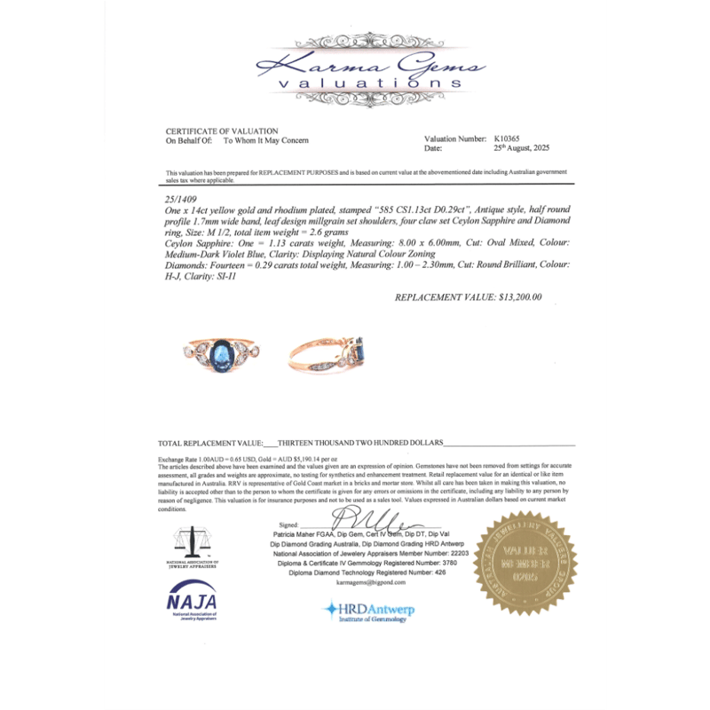 14K YELLOW GOLD, 1.13CT BLUE CEYLON SAPPHIRE AND DIAMOND, DRESS RING. The Centre Features, One Oval Cut, Medium-Dark Violet Blue, Ceylon Sapphire (1.13Ct, Displays Natural Colour Zoning), 4 Claw Set. Decorating The Setting Are, 14 Round Brilliant Cut, Diamonds (0.29Ct Tdw, H-J Colour, Si-I1 Clarity), Bead/Bezel Set. Ring Size M 1/2. Jewellery Valuations Provided By A Third Party Professional Not Directly Associated With Lloyds Auctions at AUD $$13,200.00This Insurance Valuation has been provided by a registered Jewellery Valuer and is intended for insurance purposes only. The valuation amount has no bearing on the auction value of the item. Any questions regarding the valuation should be directed to the issuing Valuer (refer to contact details on the certificate) as Lloyds have no association or relationship with the Valuer or the valuation amount contained within the valuation. Condition: NEW 0645882+66