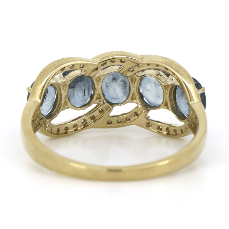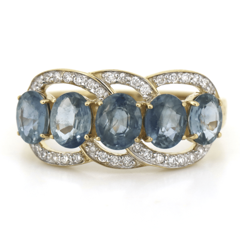 The Centre Features, 5 Oval Cut, Santa Maria Blue, Aquamarine (2.45Ct Tsw, Light-Moderate Inclusions), Shared 4 Claw Set. Decorating The Setting Are, 36 Round Brilliant Cut, Diamonds (0.14Ct Tdw, G-J Colour, Si-I2+ Clarity), Bead Set In White Gold. Ring Size M 1/2.