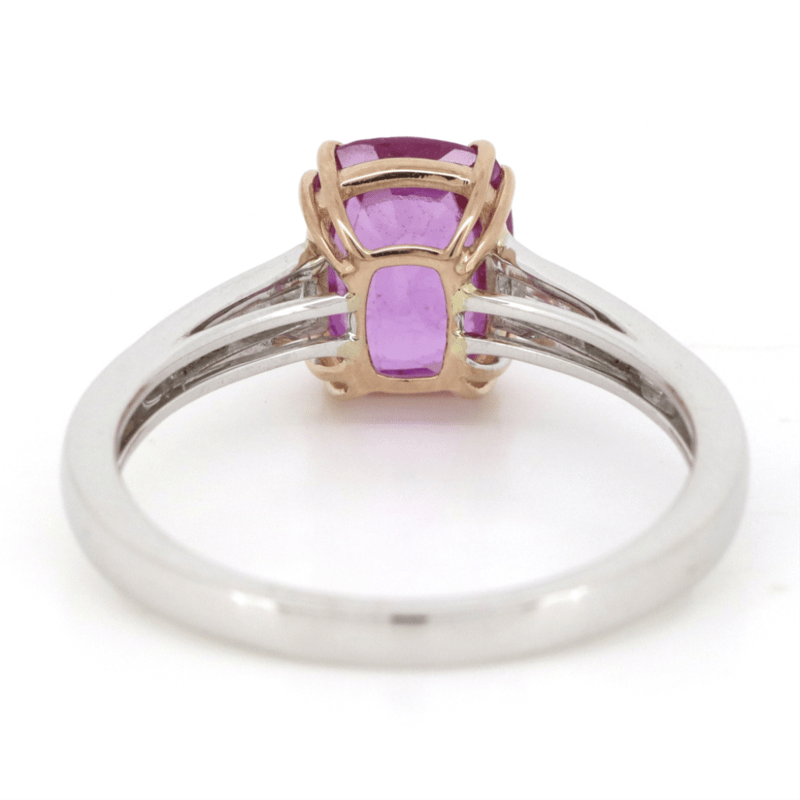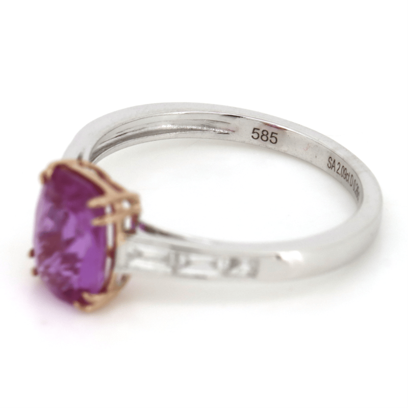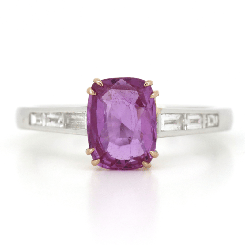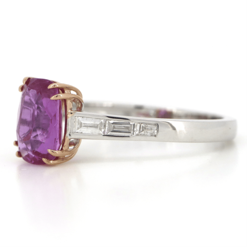 The Centre Features, One Oval Cut, Strong Purplish-Pink, Sapphire (2.09Ct, Light-Moderate Inclusions, No Heat Treatment), Double 4 Claw Set. Decorating The Band Are, 6 Baguette Cut, Diamonds (0.26Ct Tdw, G-H Colour, Si-I2 Clarity), Channel Set. Ring Size N 1/2.