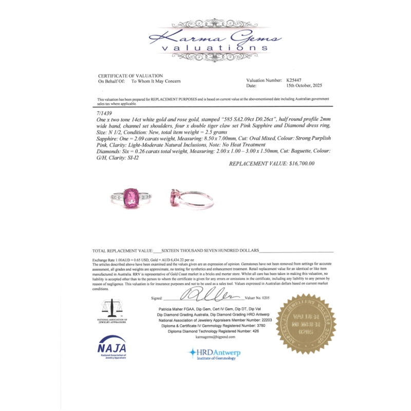 This Insurance Valuation has been provided by a registered Jewellery Valuer and is intended for insurance purposes only. The valuation amount has no bearing on the auction value of the item. Any questions regarding the valuation should be directed to the issuing Valuer (refer to contact details on the certificate) as Lloyds have no association or relationship with the Valuer or the valuation amount contained within the valuation.