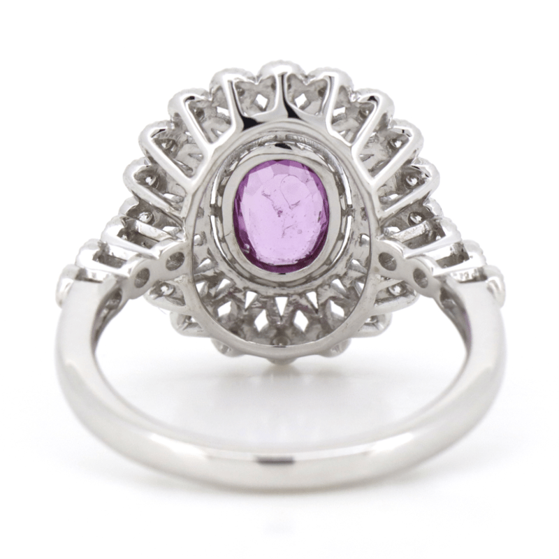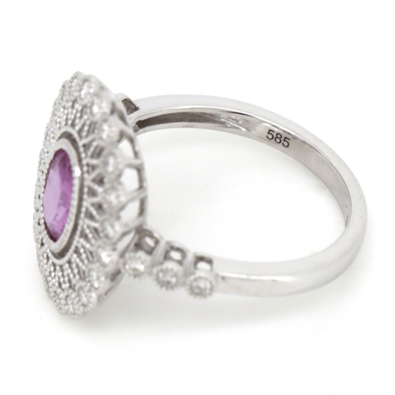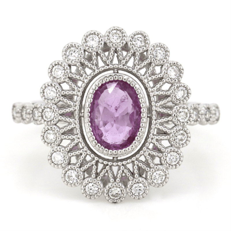 14K WHITE GOLD, PINK SAPPHIRE AND DIAMOND, HALO RING. The Centre Features, One Oval Cut, Light Pink, Sapphire (2.09Ct, Light Natural Inclusions), Bezel Set With Millegrain Detail. Surrounding The Centre In A Halo And Decorating The Band Are, 26 Round Brilliant Cut, Diamonds (0.26Ct Tdw, G-J Colour, Si-I2+ Clarity), Bezel Set With Millegrain Detail. Ring Size M 1/2. Jewellery Valuations Provided By A Third Party Professional Not Directly Associated With Lloyds Auctions at AUD $$13,400.00This Insurance Valuation has been provided by a registered Jewellery Valuer and is intended for insurance purposes only. The valuation amount has no bearing on the auction value of the item. Any questions regarding the valuation should be directed to the issuing Valuer (refer to contact details on the certificate) as Lloyds have no association or relationship with the Valuer or the valuation amount contained within the valuation. Condition: NEW 0645882+11