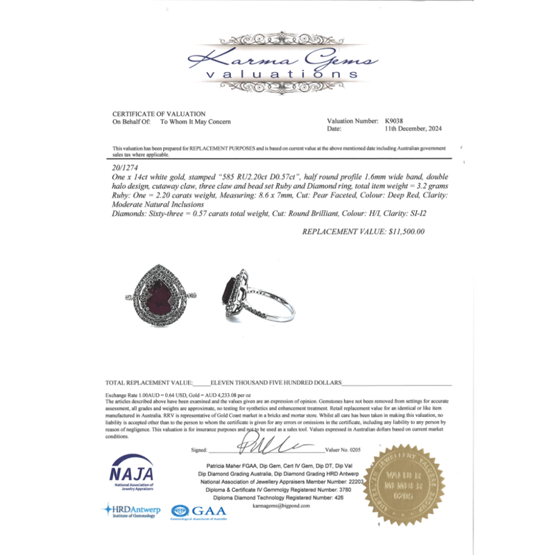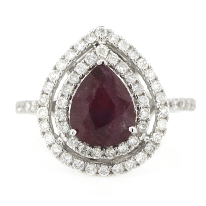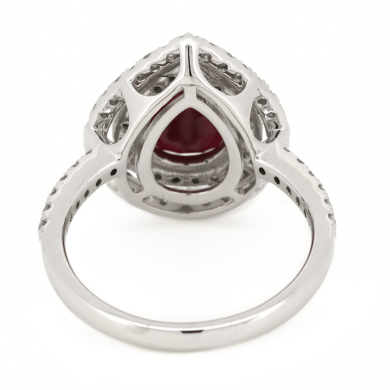 The Centre Features, One Pear Faceted Cut, Deep Red, Ruby (2.20Ct, Moderate Natural Inclusions), 3 Claw Set. Surrounding The Centre In A Double Halo And Decorating The Band Are, 63 Round Brilliant Cut, Diamonds (0.57Ct Tdw, H-I Colour, Si-I2 Clarity ), Micro-Claw Set In Yellow Gold. Ring Size L.