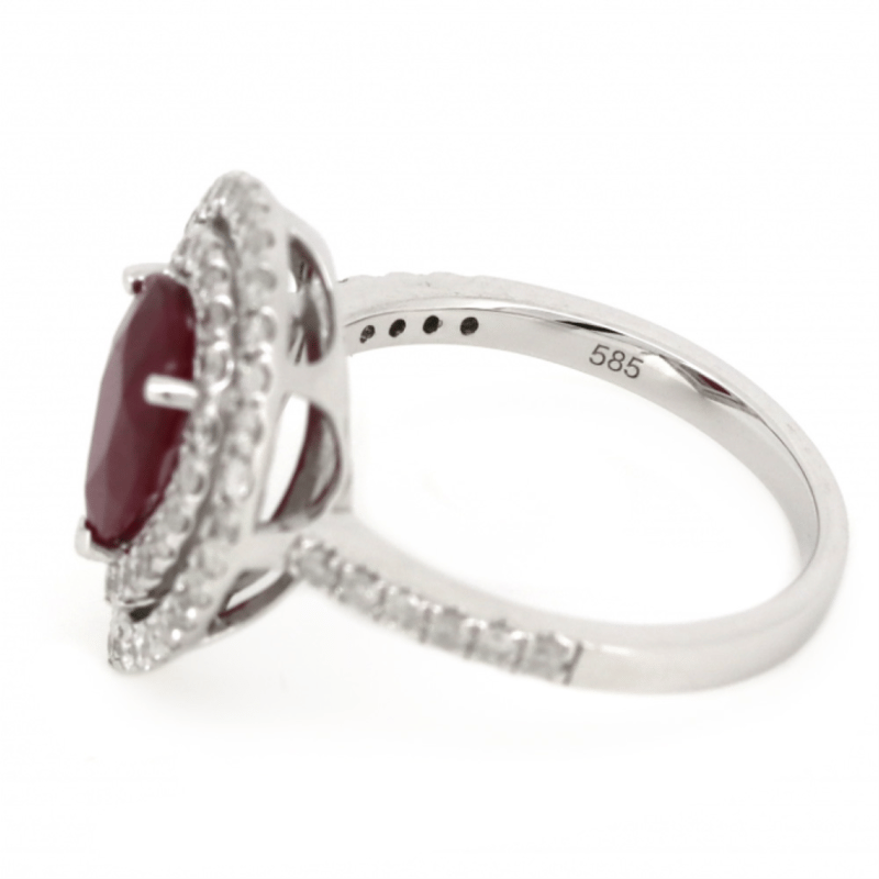 14K WHITE GOLD, RUBY AND DIAMOND, DOUBLE HALO RING.