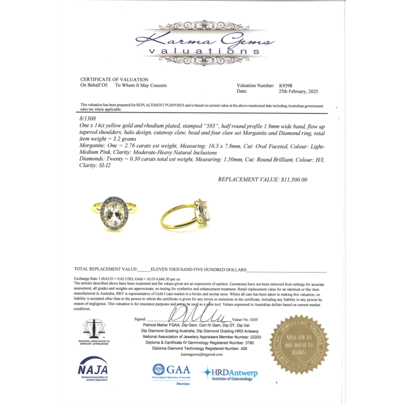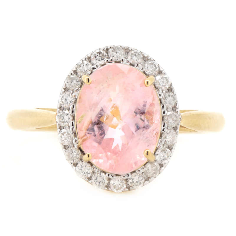 The Centre Features, One Oval Faceted Cut, Light-Medium Pink, Morganite (2.76Ct, Moderate-Heavy Natural Inclusions), Claw Set. Encompassing The Centre In A Halo Are, 20 Round Brilliant Cut, Diamonds (0.30Ct Tdw, H-I Colour, Si-I2 Clarity), Bezel Set. Ring Size N 1/2.