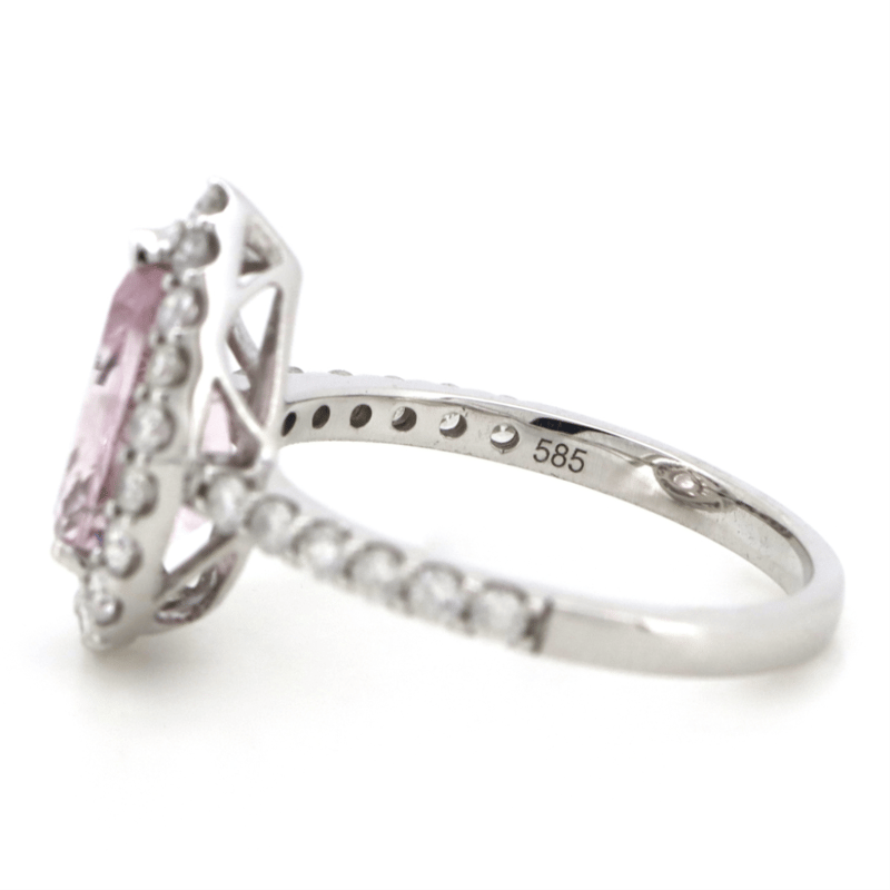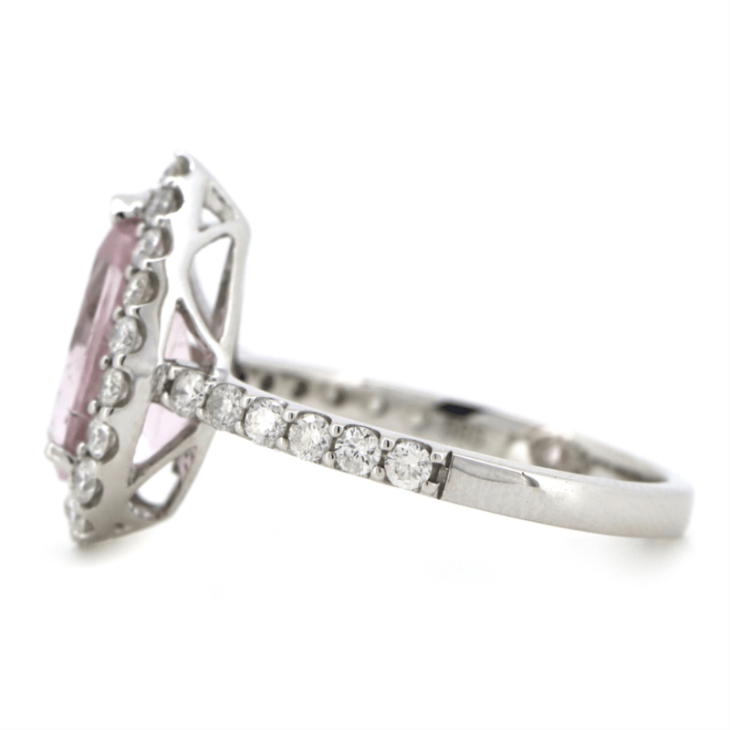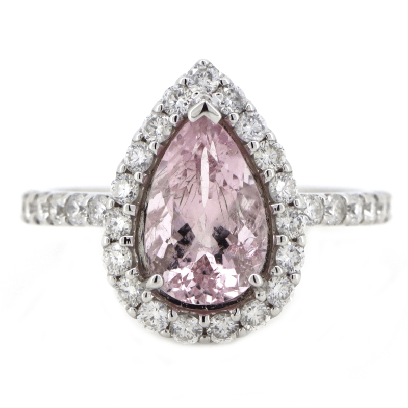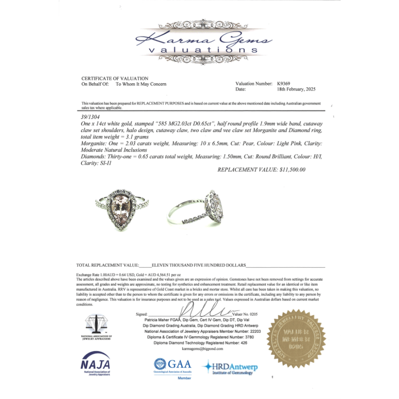 14K WHITE GOLD, MORGANITE AND DIAMOND, HALO RING. The Centre Features, One Pear Cut, Morganite (2.03Ct, Natural Inclusions), Claw Set. Surrounding The Centre In A Halo And Decorating The Band Are, 31 Round Brilliant Cut, Diamonds (0.65Ct Tdw, H-I Colour, Si-I1 Clarity), Pip-Claw Set. Ring Size M. Jewellery Valuations Provided By A Third Party Professional Not Directly Associated With Lloyds Auctions at AUD $$11,500.00 This Insurance Valuation has been provided by a registered Jewellery Valuer and is intended for insurance purposes only. The valuation amount has no bearing on the auction value of the item. Any questions regarding the valuation should be directed to the issuing Valuer (refer to contact details on the certificate) as Lloyds have no association or relationship with the Valuer or the valuation amount contained within the valuation. Condition: NEW 0 645882+1