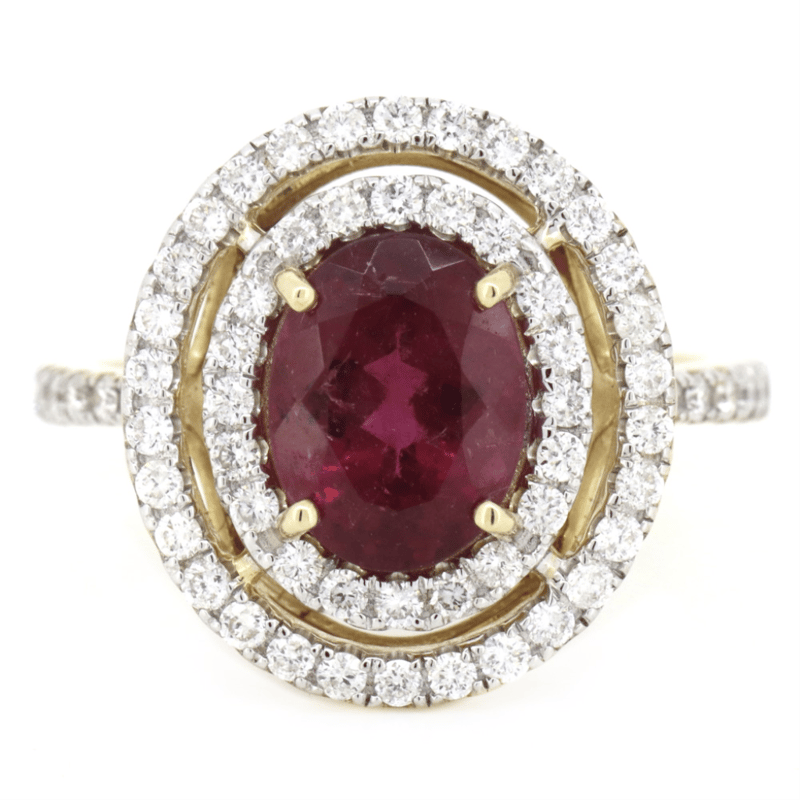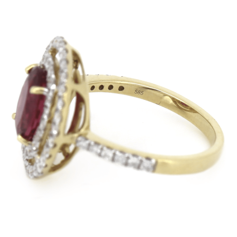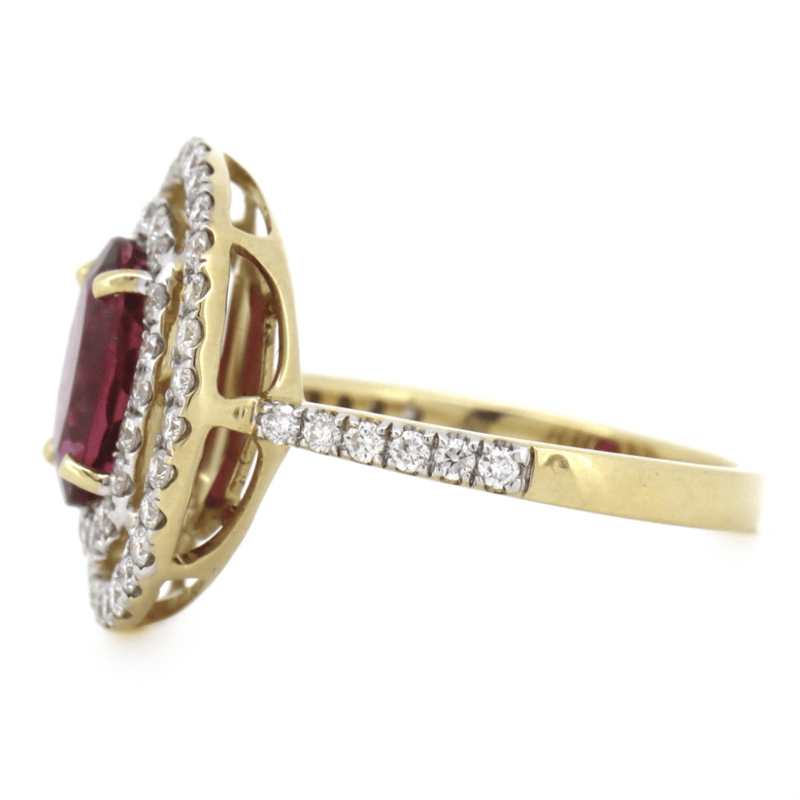 14K YELLOW GOLD, RUBELLITE AND DIAMOND, DOUBLE HALO RING.
