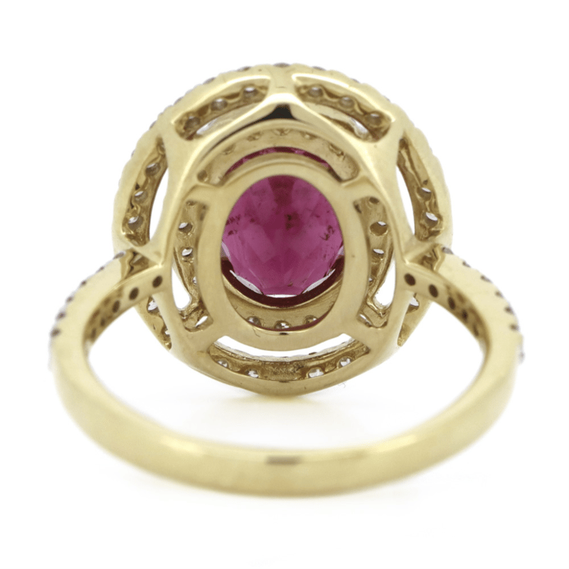 The Centre Features, One Oval Faceted Cut, Strong Pink, Rubellite (2.02Ct, Natural Inclusions), 4 Claw Set. Surrounding The Centre In A Double Halo And Decorating The Band Are, 62 Round Brilliant Cut, Diamonds (0.62Ct Tdw, G-H Colour, Si Clarity), Claw Set. Ring Size M.