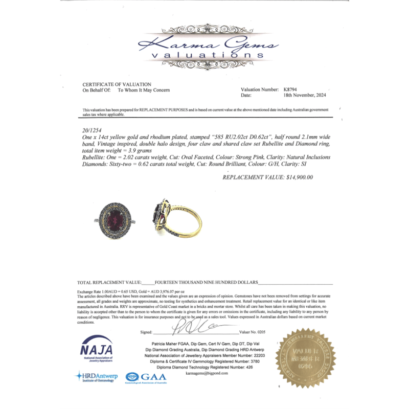 This Insurance Valuation has been provided by a registered Jewellery Valuer and is intended for insurance purposes only. The valuation amount has no bearing on the auction value of the item. Any questions regarding the valuation should be directed to the issuing Valuer (refer to contact details on the certificate) as Lloyds have no association or relationship with the Valuer or the valuation amount contained within the valuation.