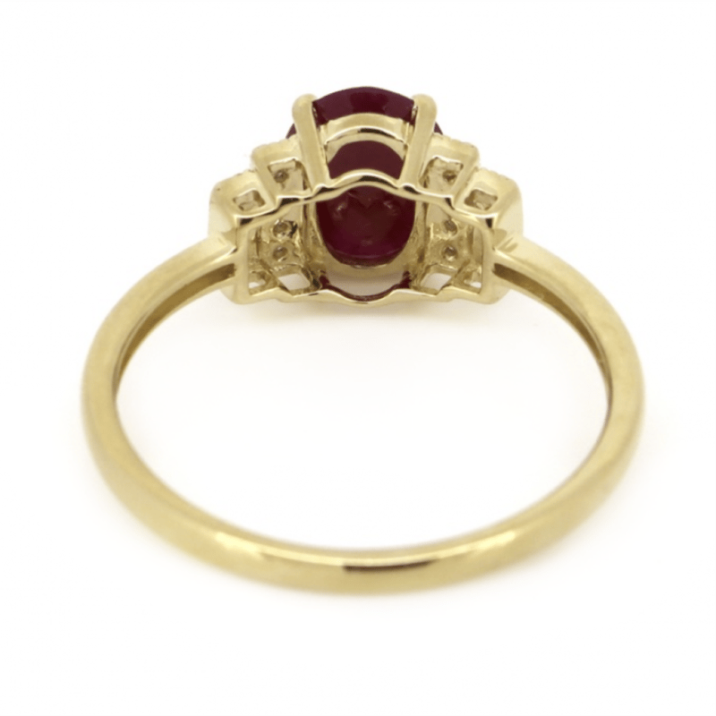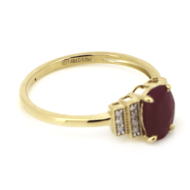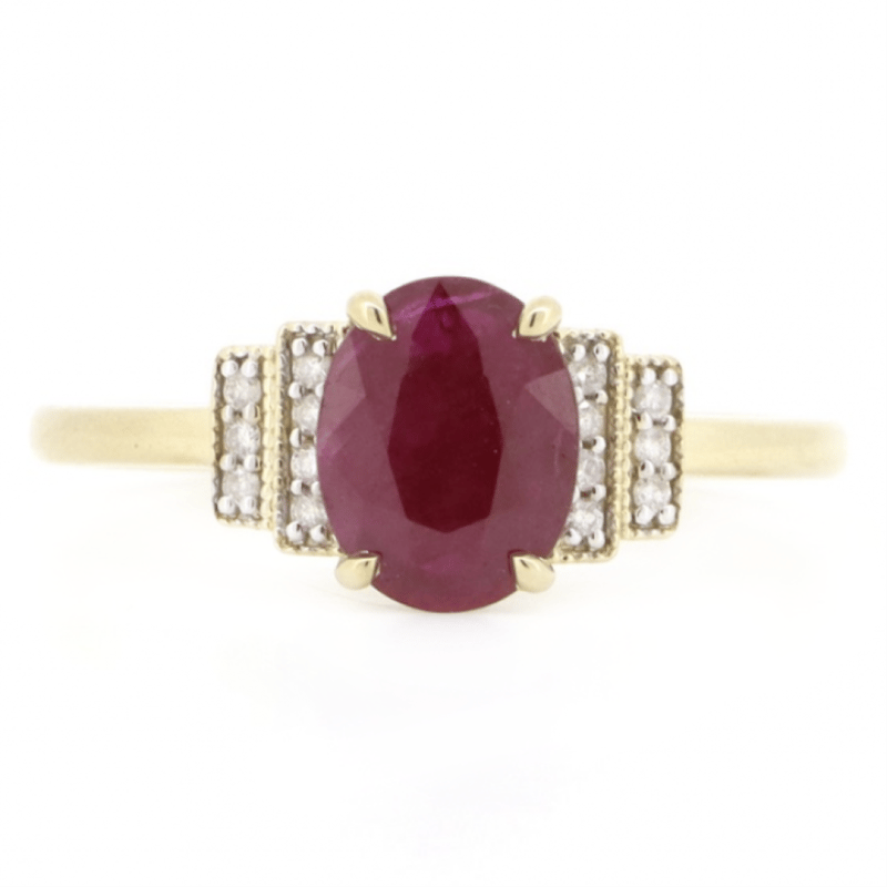 The Centre Features, One Oval Cut, Deep Red, Ruby (1.48Ct, Moderately Included), Claw Set. Flanking The Centre Are, 14 Round Brilliant Cut, Diamonds (0.09Ct Tdw, H Colour, Si Clarity), Bead Set With Millegrain Detail.