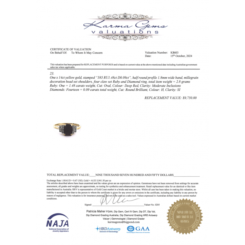 This Insurance Valuation has been provided by a registered Jewellery Valuer and is intended for insurance purposes only. The valuation amount has no bearing on the auction value of the item. Any questions regarding the valuation should be directed to the issuing Valuer (refer to contact details on the certificate) as Lloyds have no association or relationship with the Valuer or the valuation amount contained within the valuation.