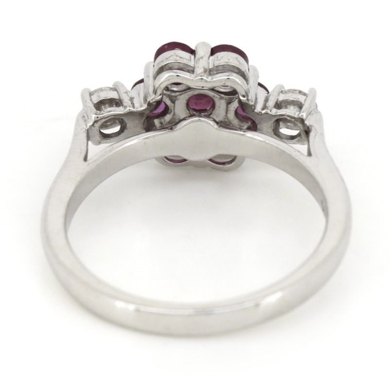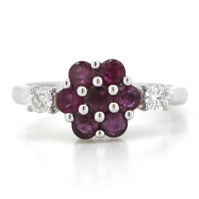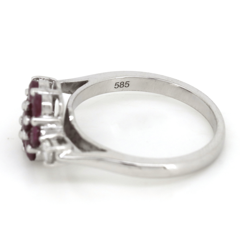 14K WHITE GOLD, RUBY AND DIAMOND, FLORAL RING.