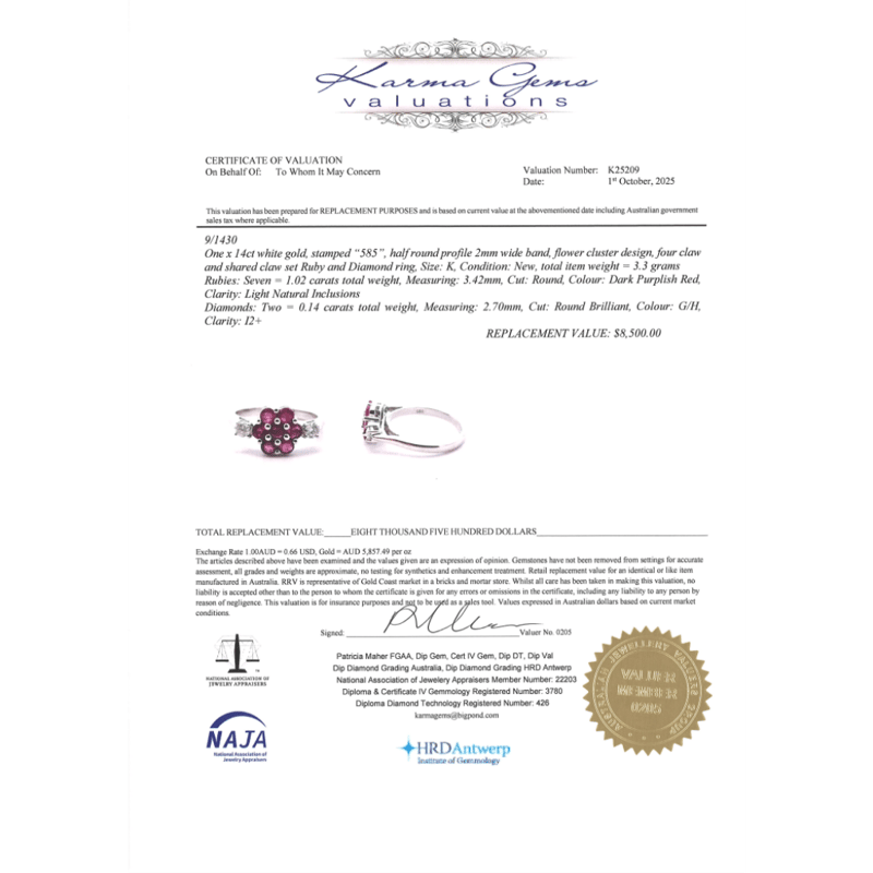 The Design Features, 7 Round Cut, Dark Purplish-Red, Rubies (1.02Ct Tsw, Light Natural Inclusions), Shared Claw Set. Flanking The Central Design Are, 2 Round Brilliant Cut, Diamonds (0.14Ct Tdw, G-H Colour, I2+ Clarity), 4 Claw Set. Ring Size K.