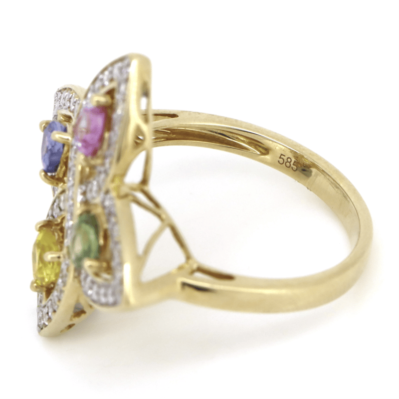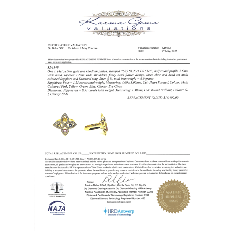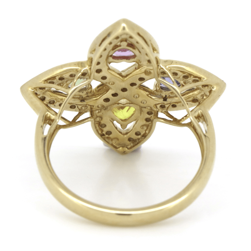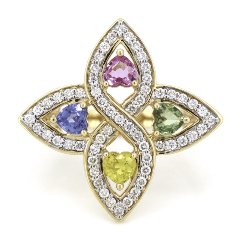 The Design Features, 4 Heart Faceted Cut, Pink, Yellow, Green And Blue, Sapphires (1.23Ct Tsw, Eye Clean Clarity), 3 Claw Set. Encompassing The Design Are, 57 Round Brilliant Cut, Diamonds (0.51Ct Tdw, G-I Colour, Si-I1 Clarity), Bead Set. Ring Size Q 1/2.