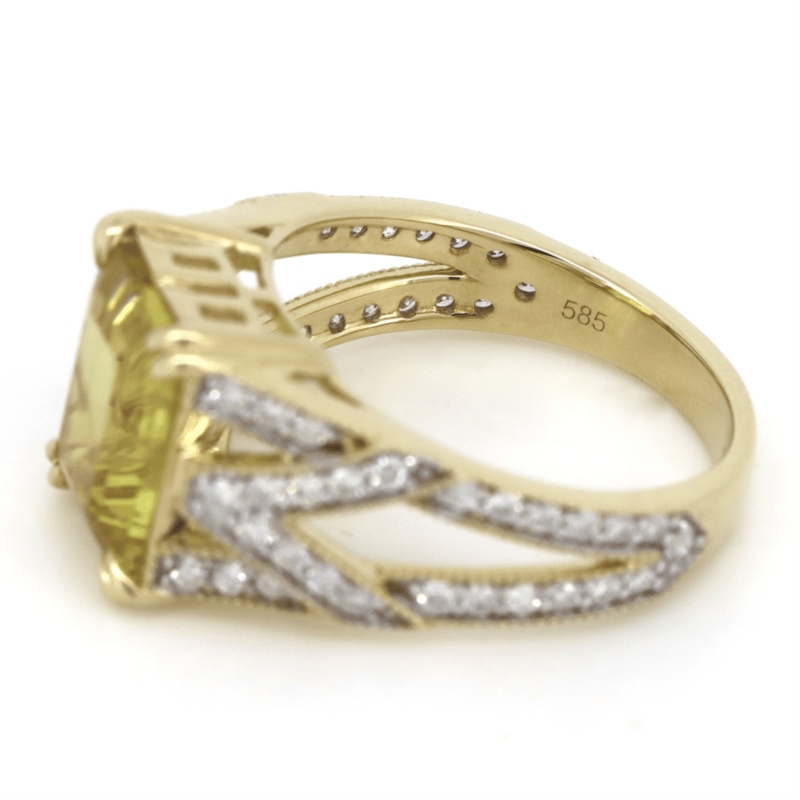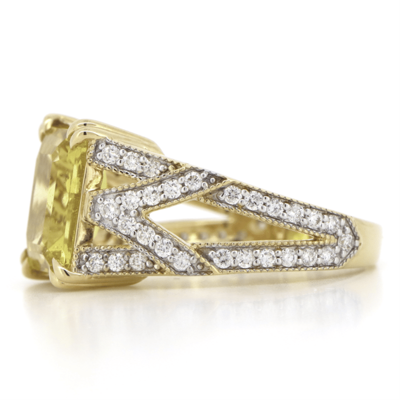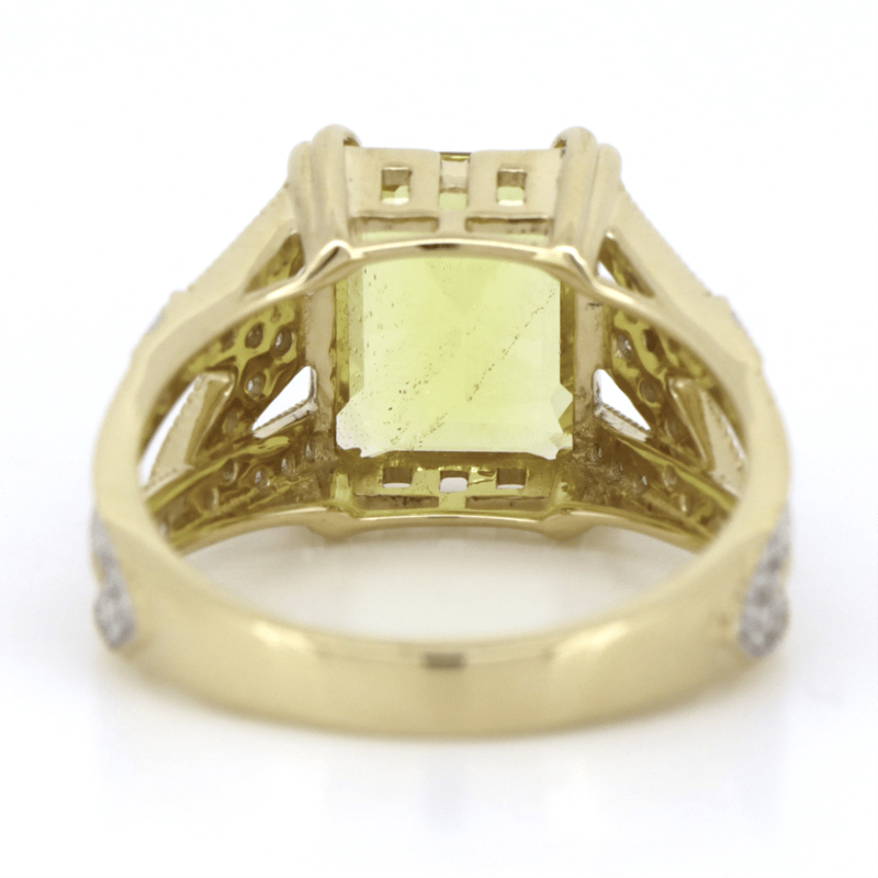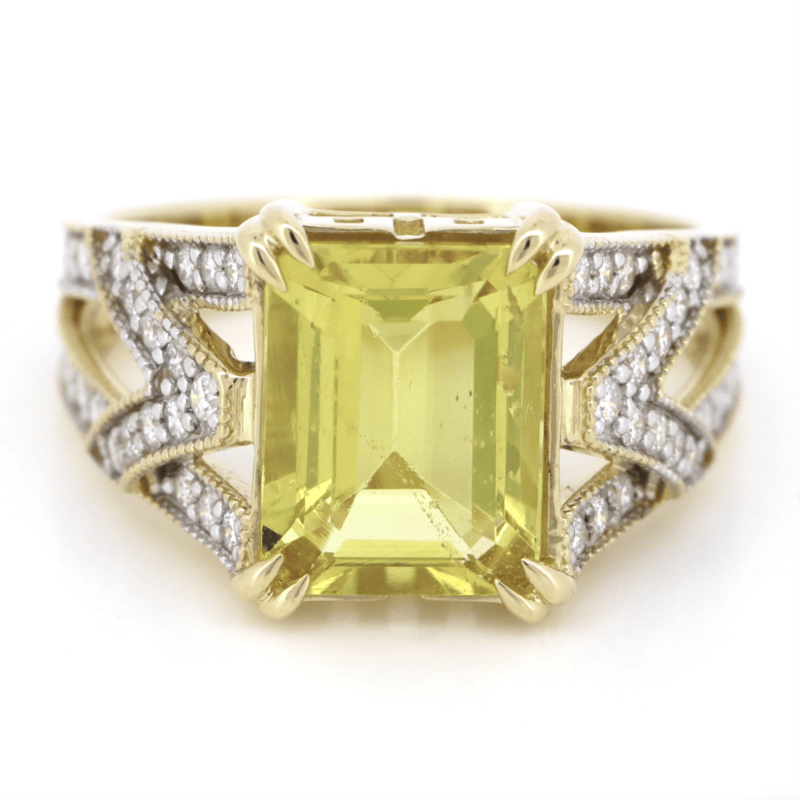 The Centre Features, One Emerald Cut, Golden Yellow, Heliodor (3.49Ct, Lightly Included), Double 4 Claw Set. Embellishing The Centre Are, 56 Round Brilliant Cut, Diamonds (0.57Ct Tdw, G-I Colour, Si-I2+ Clarity), Micro-Bead Set In White Gold. Ring Size M 1/2.