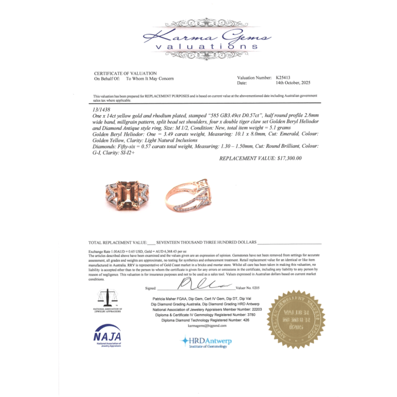 This Insurance Valuation has been provided by a registered Jewellery Valuer and is intended for insurance purposes only. The valuation amount has no bearing on the auction value of the item. Any questions regarding the valuation should be directed to the issuing Valuer (refer to contact details on the certificate) as Lloyds have no association or relationship with the Valuer or the valuation amount contained within the valuation.