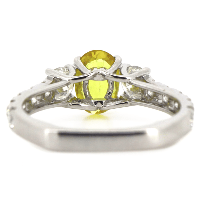 The Centre Features, One Oval Mixed Cut, Golden Yellow, Sapphire (0.90Ct, Light Natural Inclusions), Claw Set. Decorating The Shoulders Are, 2 Round Brilliant Cut, Diamonds (0.48Ct Tdw, H Colour, Si1 Clarity), Claw Set. Embellishing The Band Are, 10 Round Brilliant Cut, Diamonds (0.47Ct Tdw, H Colour, Si-I2 Clarity), Claw Set. Ring Size M.