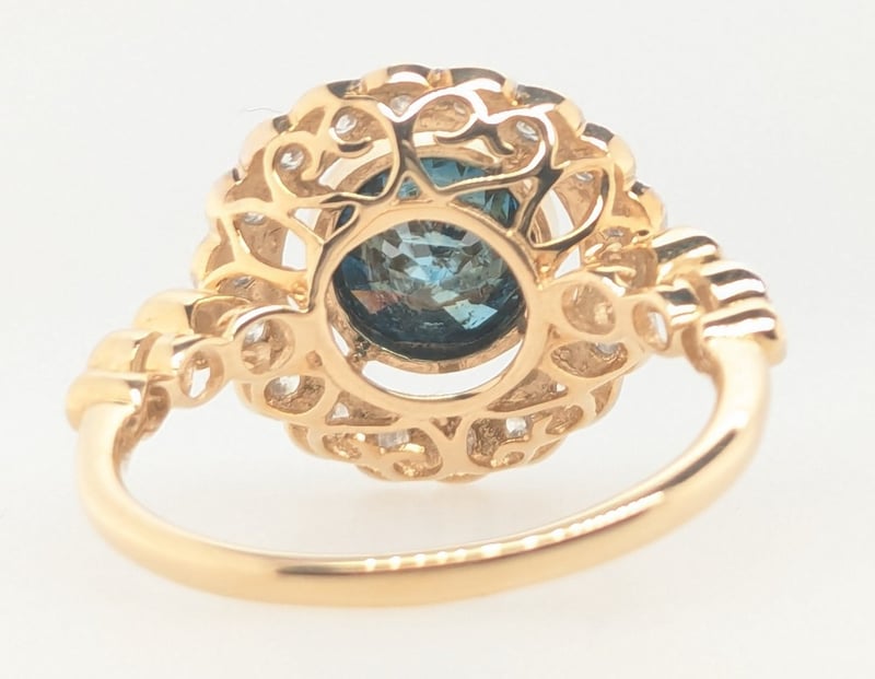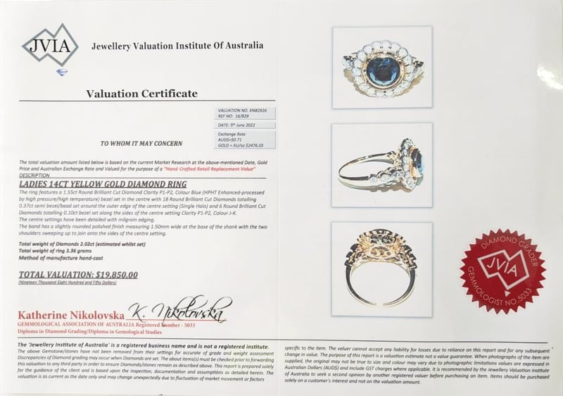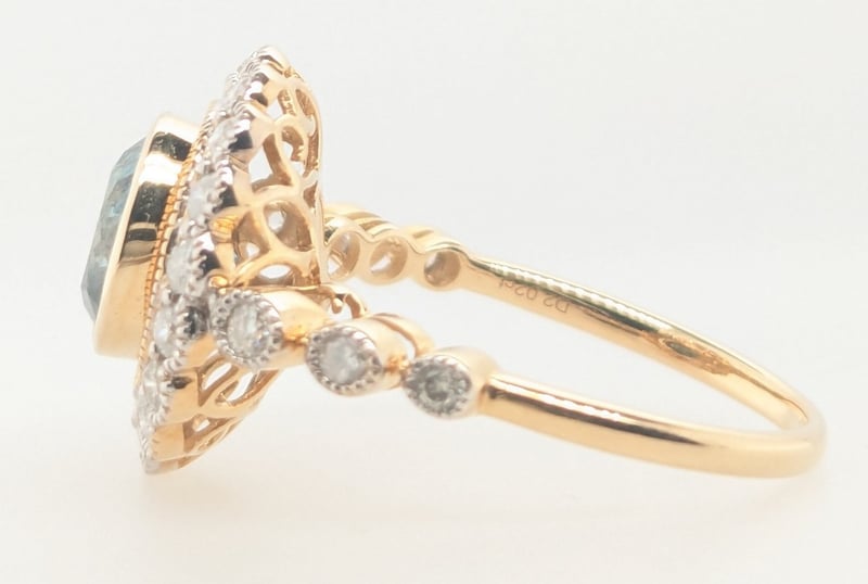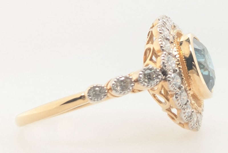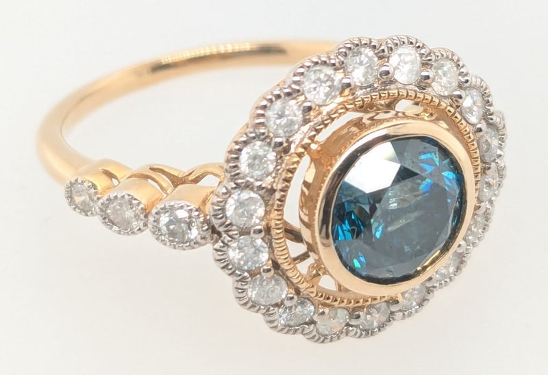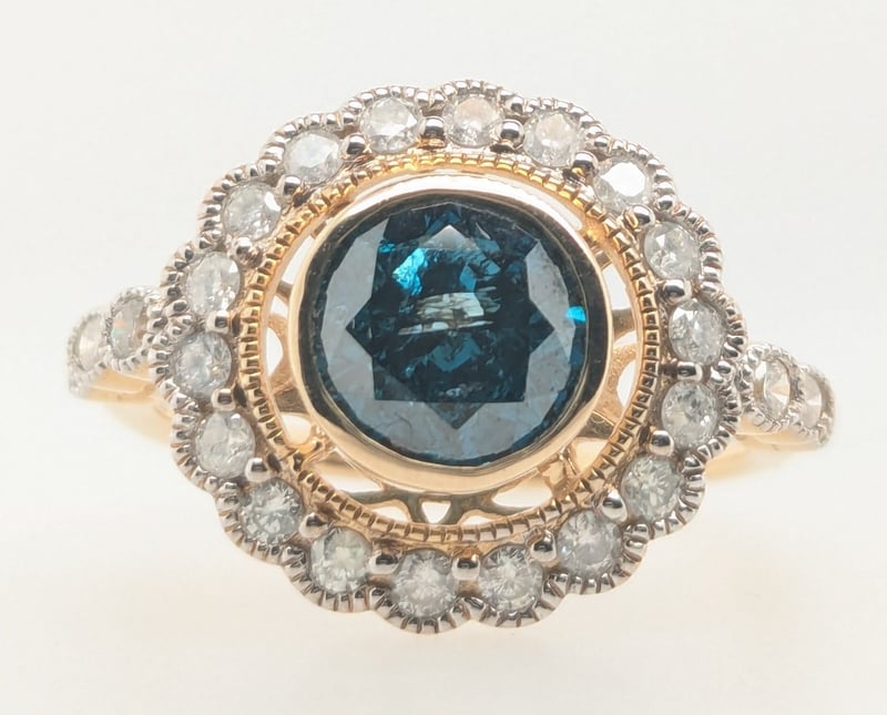 14CT YELLOW GOLD, BLUE DIAMOND, ANTIQUE STYLE HALO RING. Accompanied By Jvia Valuation Certificate. The Centre Features, One Round Brilliant Cut, Blue, Diamond (1.55Ct, P1-P2 Clarity, Hpht Enhanced), Bezel Set. Surrounding The Centre In A Halo And Decorating The Band Are, 24 Round Brilliant Cut, Diamonds (0.47Ct Tdw, J-K Colour, P1-P2 Clarity), Semi-Bezel/Bead Set. The Centre Settings Have Been Detailed With Millegrain Edging. Ring Size M 1/2. Condition: Good - Refer To Images This valuation has been conducted by an independent third-party professional. The valuation amount is an assessment by the issuing valuer and does not reflect the auction value of the item. Any inquiries regarding the valuation should be directed to the issuing valuer (refer to contact details on the certificate), as Lloyds Auctions has no affiliation or influence over the valuation, the valuer, or the stated amount. Insurance Replacement Valuation Amount: $19,850.00 FC 162993+15