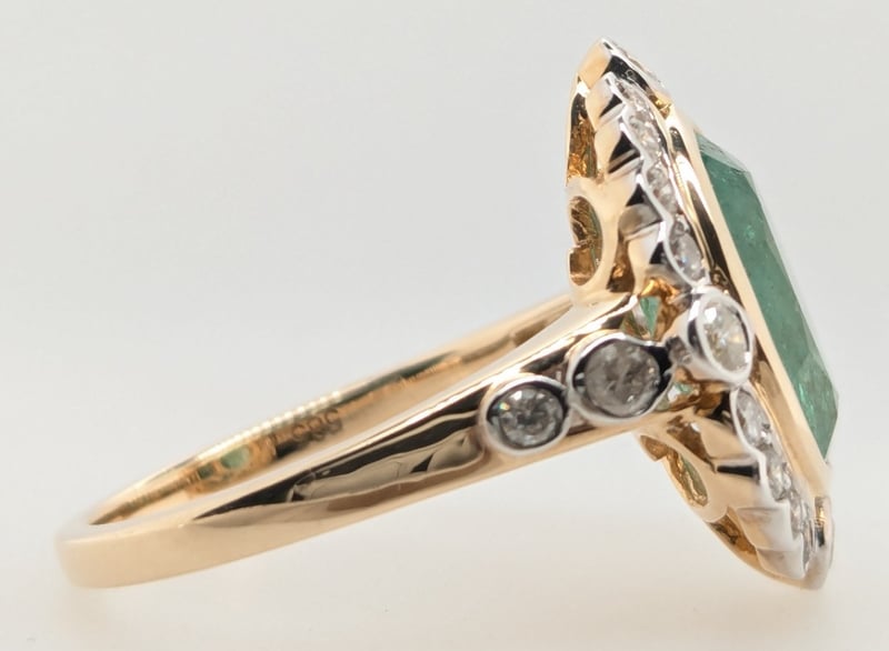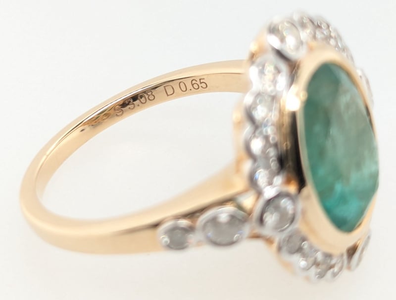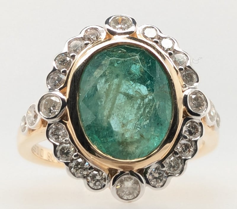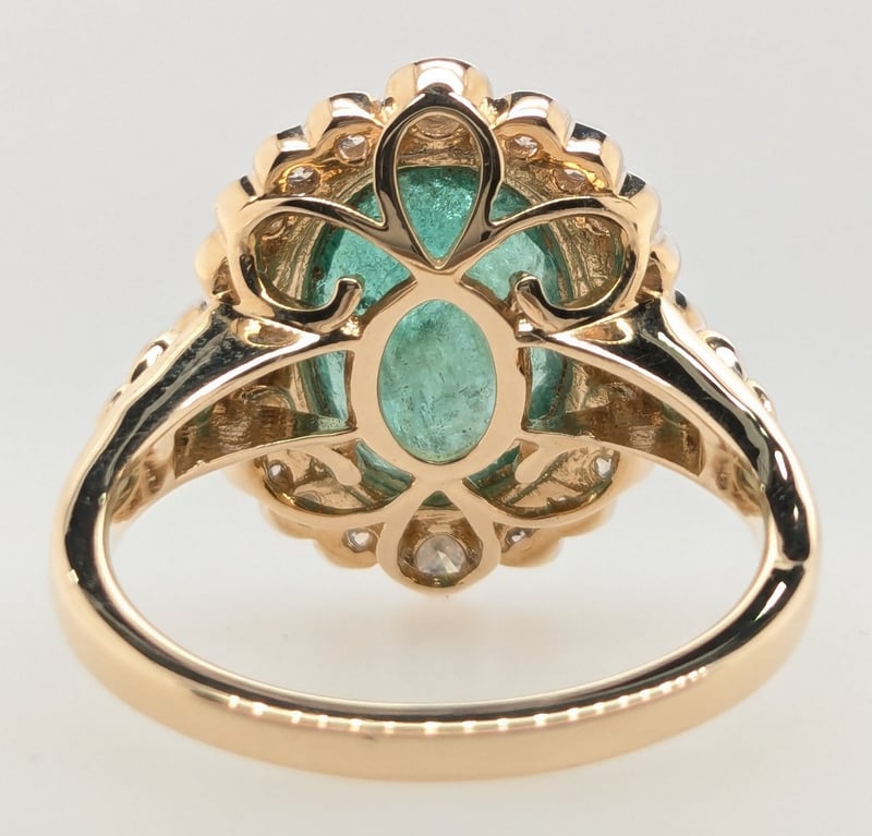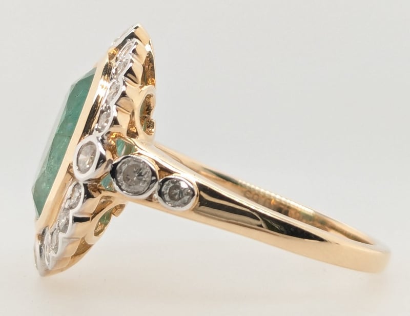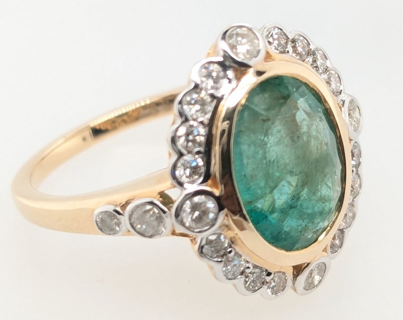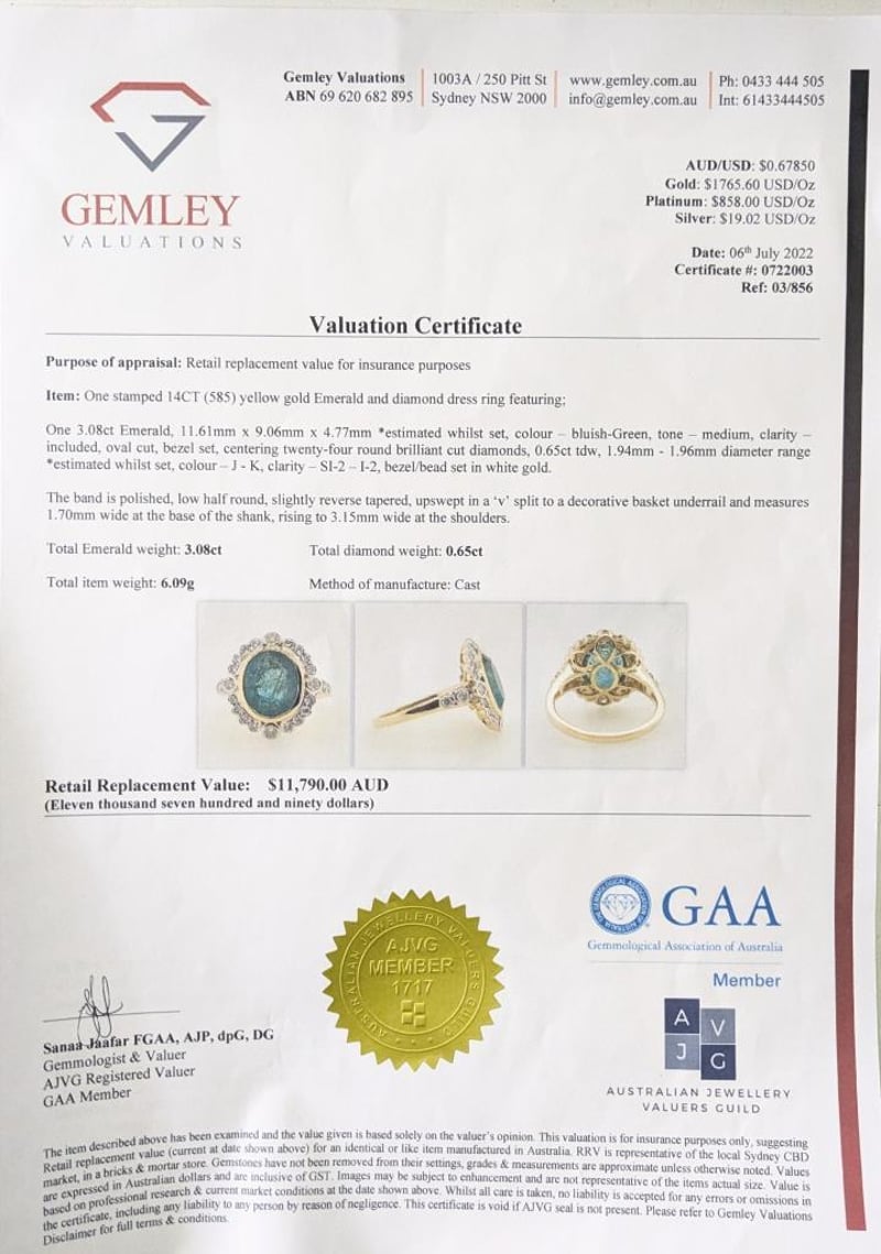 14K YELLOW GOLD, EMERALD AND DIAMOND, VINTAGE INSPIRED HALO RING.Accompanied By Gemley Valuation Certificate.The Emerald Has Natural Inclusions That Have Reached The Surface, Resulting In Very Small Surface Reaching Fractures. The Centre Features, One Oval Cut, Medium Bluish-Green, Emerald (3.08Ct, Included), Bezel Set. Surrounding The Centre In A Halo And Decorating The Shoulders Are, 24 Round Brilliant Cut, Diamonds (0.65Ct Tdw, J-K Colour, Si2-I2 Clarity), Bezel/Bead Set In White Gold. Ring Size O.Condition: Good - Refer To ImagesThis valuation has been conducted by an independent third-party professional. The valuation amount is an assessment by the issuing valuer and does not reflect the auction value of the item.Any inquiries regarding the valuation should be directed to the issuing valuer (refer to contact details on the certificate), as Lloyds Auctions has no affiliation or influence over the valuation, the valuer, or the stated amount.Insurance Replacement Valuation Amount: $11,790.00FC162993+3