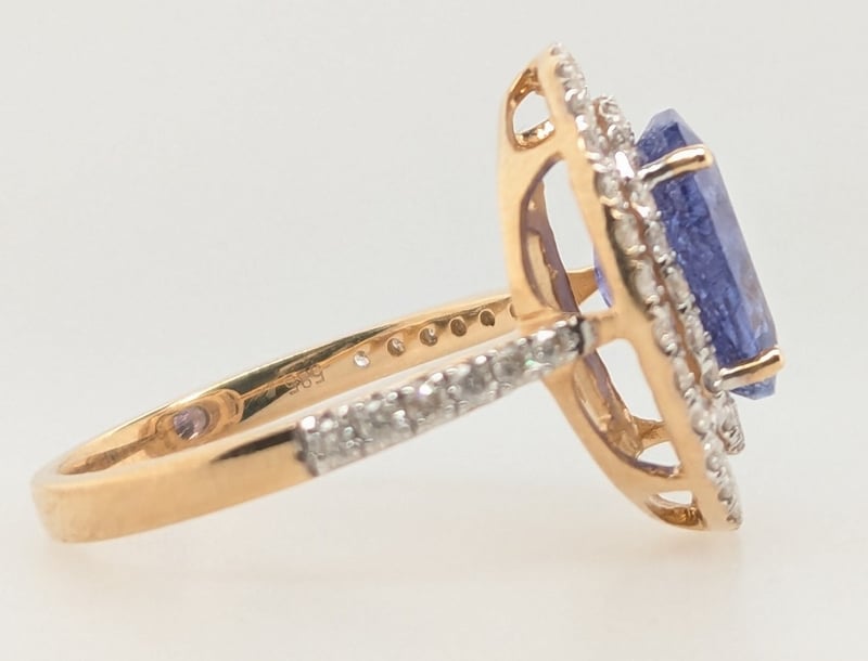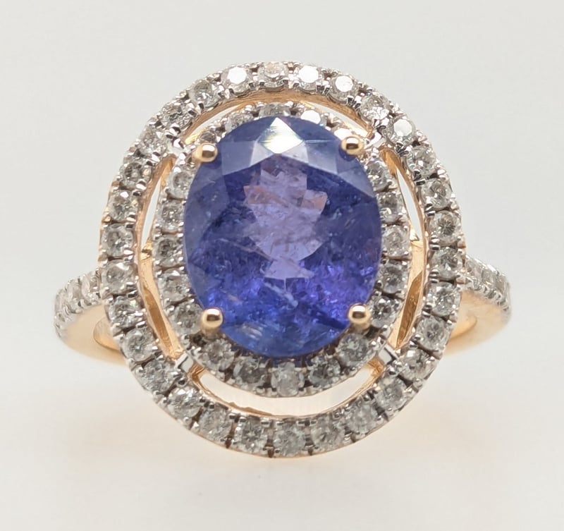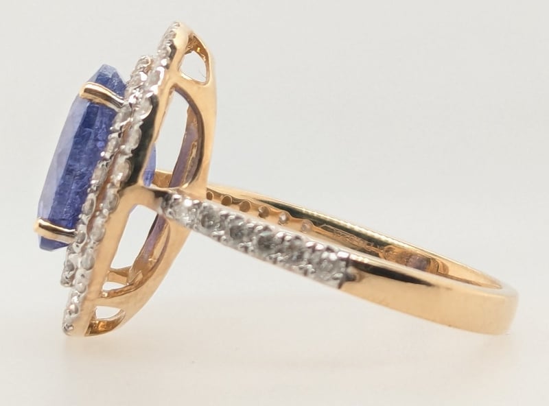 14K YELLOW GOLD, TANZANITE AND DIAMOND, DOUBLE HALO RING.