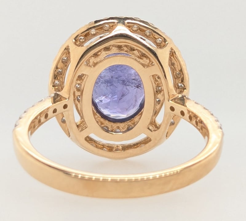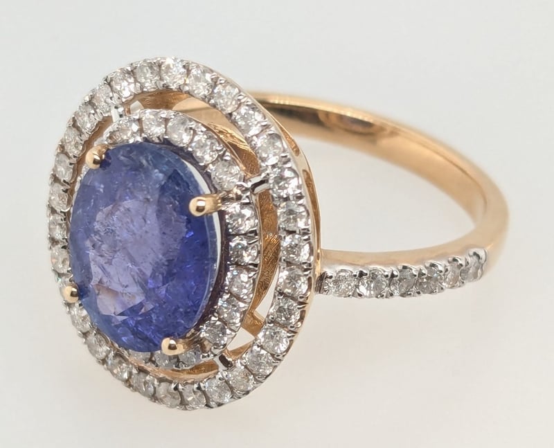 The Centre Features, One Oval Faceted Cut, Bluish-Violet, Tanzanite (2.92Ct, Included), 4 Claw Set. Surrounding The Centre In A Double Halo And Decorating The Band Are, 62 Round Brilliant Cut, Diamonds (0.62Ct Tdw, I-K Colour, P1-P2 Clarity), Claw Set. Ring Size M 1/2.