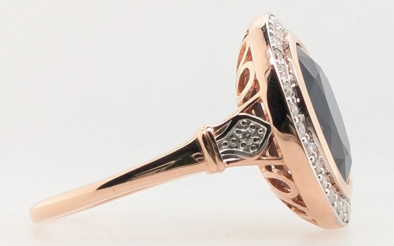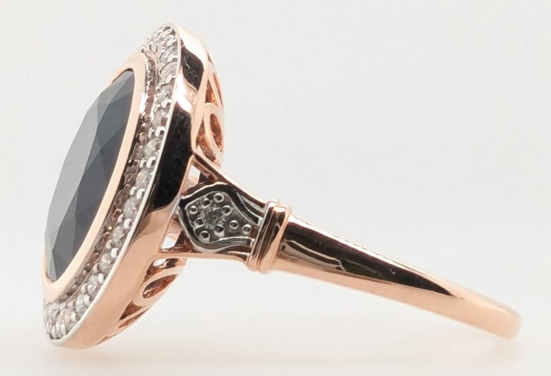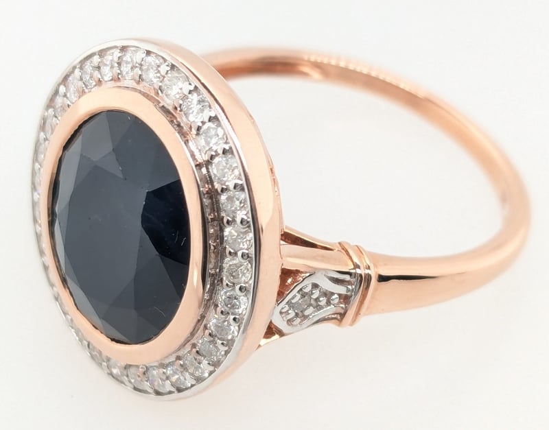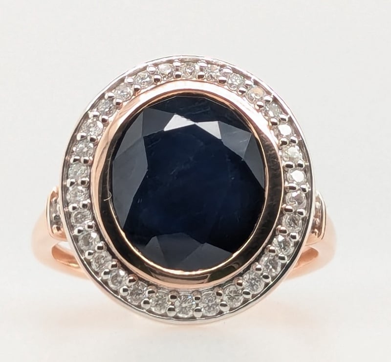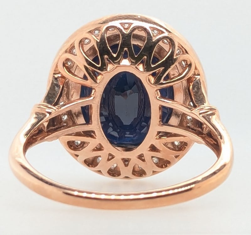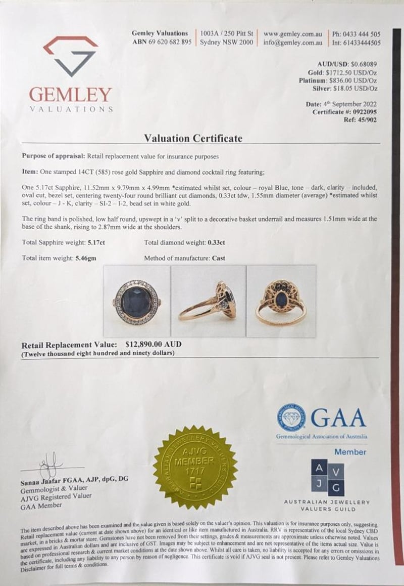 14K ROSE GOLD, BLUE SAPPHIRE AND DIAMOND, HALO STATEMENT RING.Accompanied By Gemley Valuation Certificate.The Centre Features, One Oval Cut, Dark Royal Blue, Sapphire (5.17Ct, Included), Bezel Set. Surrounding The Centre In A Halo And Decorating The Shoulders Are, 24 Round Brilliant Cut, Diamonds (0.33Ct Tdw, J-K Colour, Si2-I2 Clarity), Bead Set In White Gold. Ring Size O.Condition: Good - Refer To ImagesThis valuation has been conducted by an independent third-party professional. The valuation amount is an assessment by the issuing valuer and does not reflect the auction value of the item.Any inquiries regarding the valuation should be directed to the issuing valuer (refer to contact details on the certificate), as Lloyds Auctions has no affiliation or influence over the valuation, the valuer, or the stated amount.Insurance Replacement Valuation Amount: $12,890.00FC162993+2
