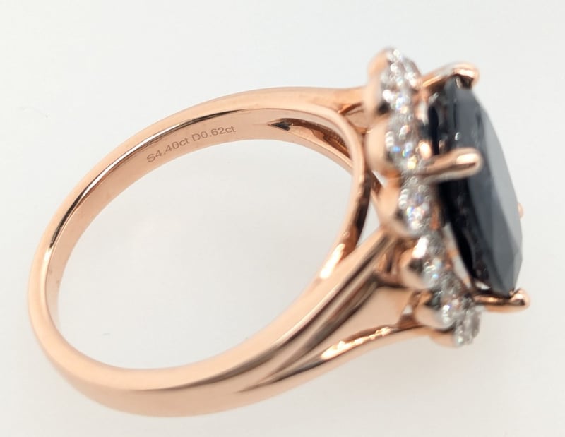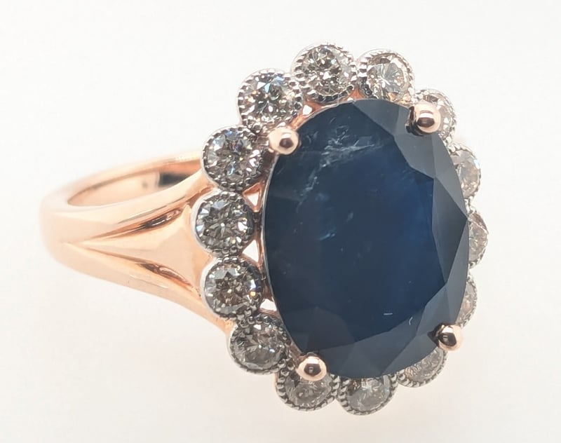 The Centre Features, One Oval Cut, Dark Blue, Sapphire (4.40Ct, Slightly Included), 4 Claw Set. Surrounding The Centre In A Halo Are, 14 Round Brilliant Cut, Diamonds (0.62Ct Tdw, J-M Colour, Si1-P2 Clarity), Bezel Set With Millegrain Detail. Ring Size O.