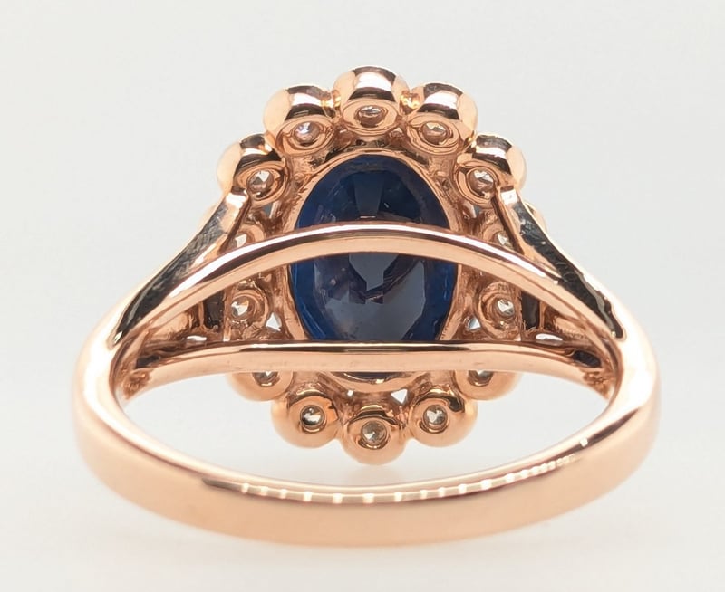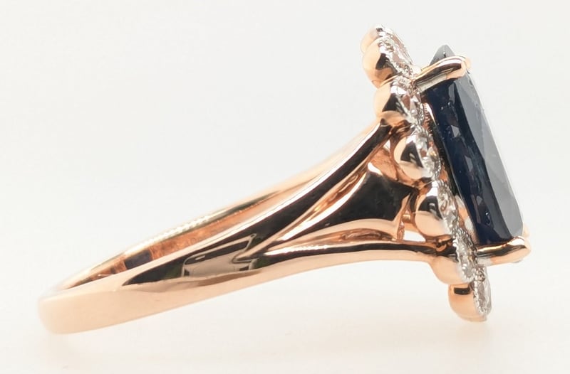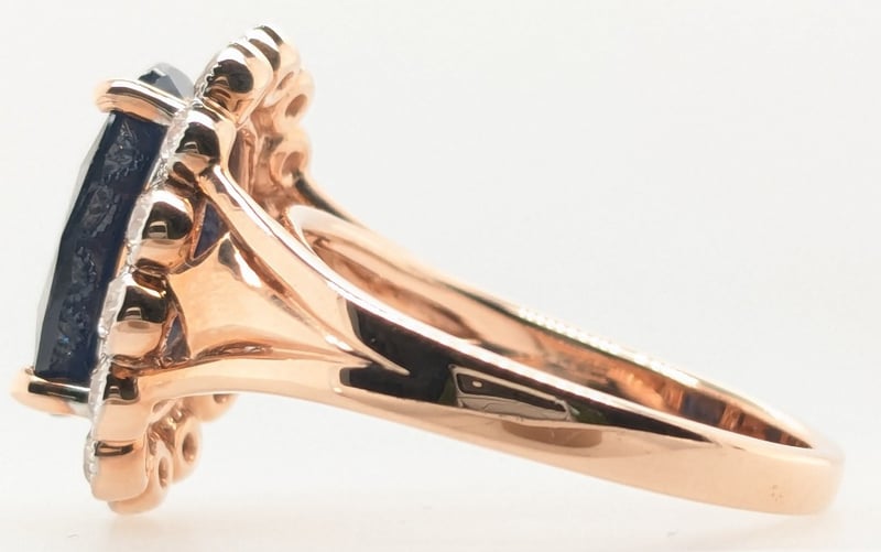 14K ROSE GOLD, BLUE SAPPHIRE AND DIAMOND, FLORAL DESIGN HALO RING.