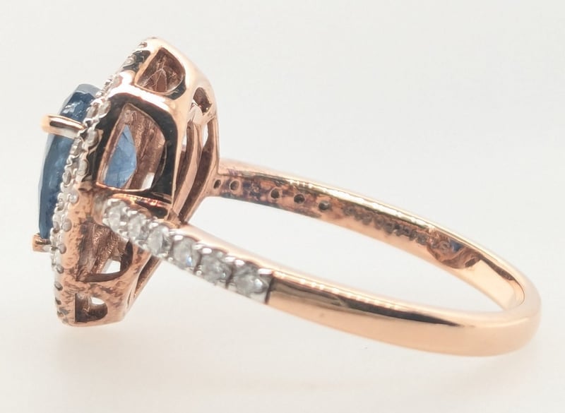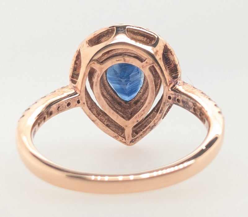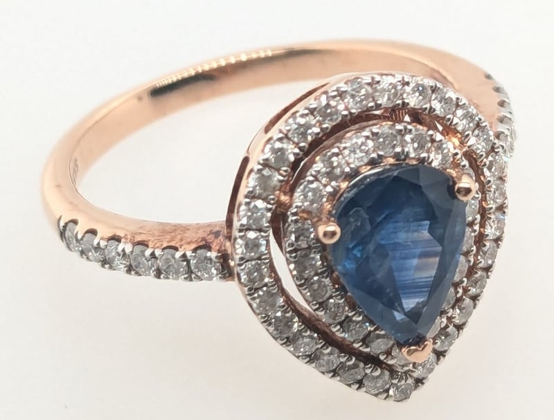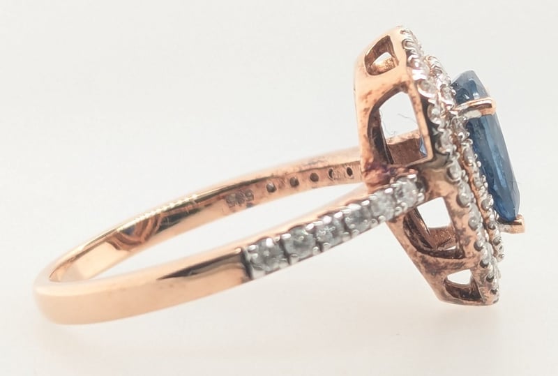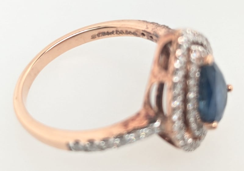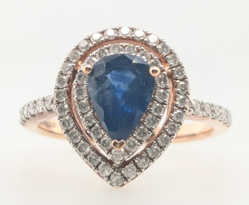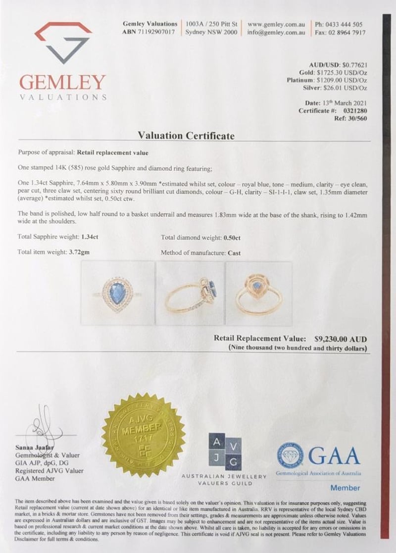 14CT ROSE GOLD, BLUE SAPPHIRE AND DIAMOND, DOUBLE HALO RING. Accompanied By Gemley Valuation Certificate. The Centre Features, One Pear Cut, Medium Royal Blue, Sapphire (1.34Ct, Eye Clean Clarity), 3 Claw Set. Surrounding The Centre In A Double Halo And Decorating The Band Are, 60 Round Brilliant Cut, Diamonds (0.50Ct Tdw, G-H Colour, Si1-I1 Clarity), Claw Set. Ring Size M 1/2. Dimensions: Height: 7.64mm, Width: 5.80mm, Depth: 3.90mm Condition: Good - Refer To Images This valuation has been conducted by an independent third-party professional. The valuation amount is an assessment by the issuing valuer and does not reflect the auction value of the item. Any inquiries regarding the valuation should be directed to the issuing valuer (refer to contact details on the certificate), as Lloyds Auctions has no affiliation or influence over the valuation, the valuer, or the stated amount. Insurance Replacement Valuation Amount: $9,230.00 FC 162993+14