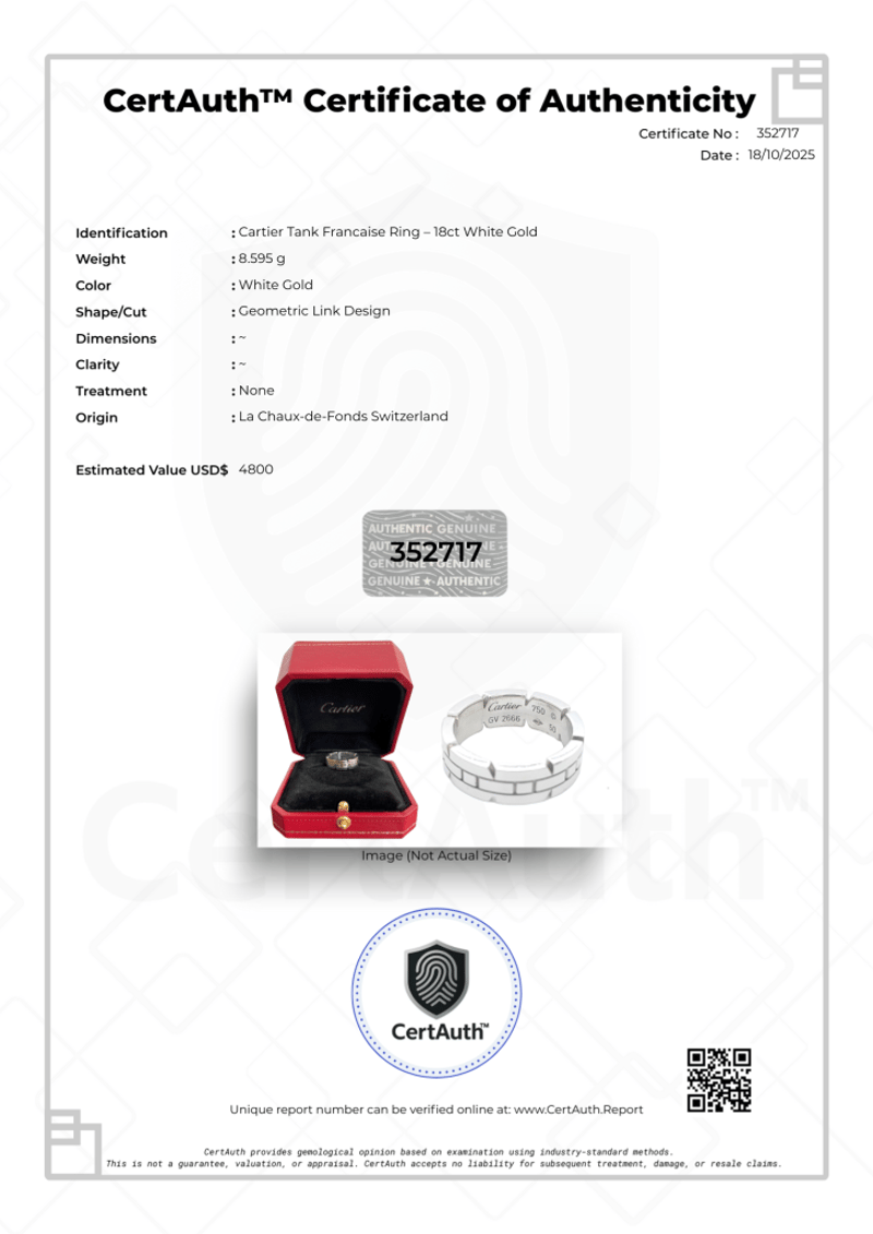 CARTIER TANK FRANCAISE RING – 18CT WHITE GOLD – CERTAUTH CERTIFIED