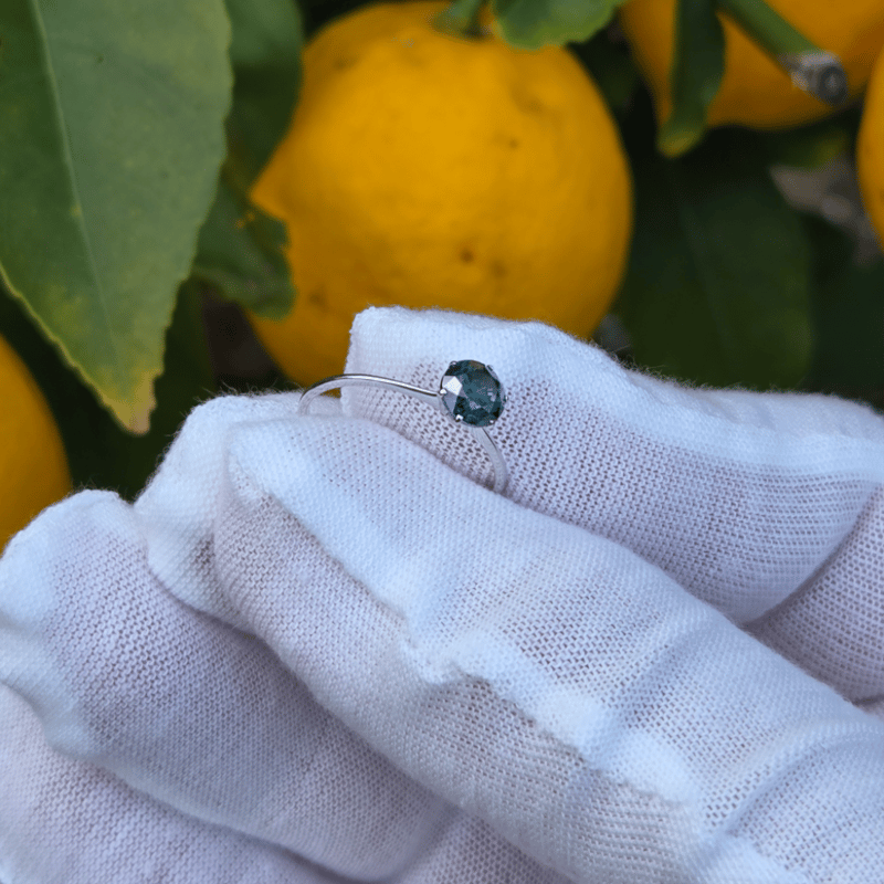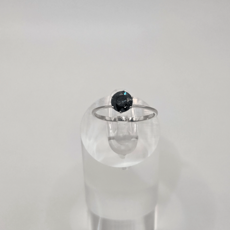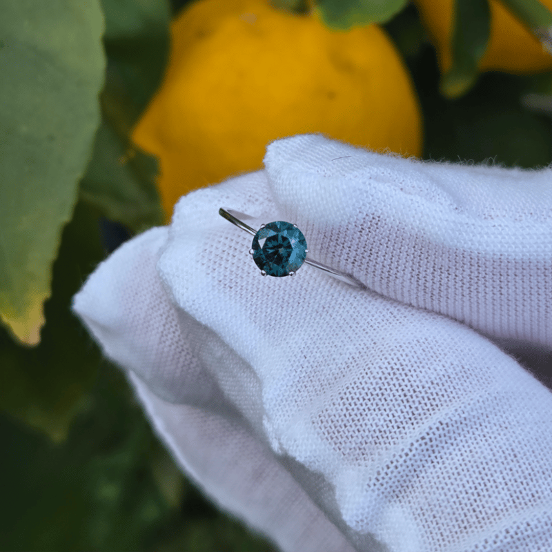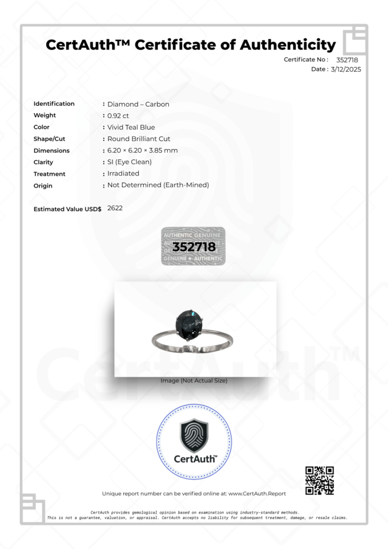A Solitaire Ring Featuring A 0.92 Carat Round Brilliant Cut Diamond. The Gemstone Displays A Striking Vivid Teal Blue Colour And Is Described As "Eye Clean" With Si Clarity. The Diamond Is Earth-Mined And Has Undergone Irradiation Treatment To Achieve Its Intense Hue. It Is Set In 14K White Gold. Includes Certauth Certificate Of Authenticity.