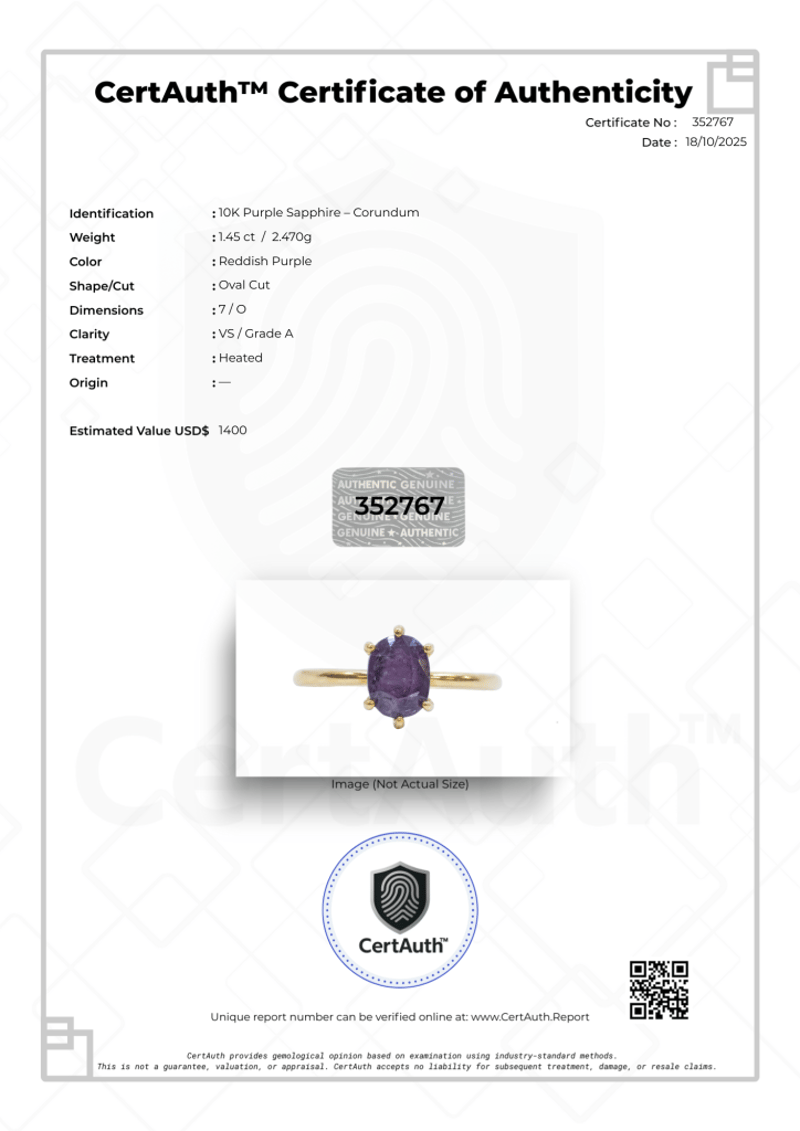1.45CT PURPLE SAPPHIRE RING – 10K GOLD – OVAL CUT – CERTAUTH CERTIFIED An Ring Featuring A 1.45 Ct Purple Sapphire (Corundum) With A Distinctive Reddish Purple Hue. The Gemstone Is An Oval Cut With Vs / Grade A Clarity And Has Been Heated To Enhance Its Appearance. The Piece Has A Total Weight Of 2.470G And Is Identified As 10K (Indicating 10 Karat Gold). Includes Certauth Certificate Of Authenticity.Details:• Gemstone: Purple Sapphire – Corundum• Carat Weight: 1.45 Ct (Total Item Weight: 2.470G)• Colour: Reddish Purple• Cut: Oval Cut• Clarity: Vs / Grade A• Treatment: Heated• Metal: 10K Gold• Dimensions: See Ring Size• Ring Size: 7 (Us) / O (Uk/Au)• Origin: —• Certification: Certauth Certificate 352767• Estimated Value: $1400 Usd Valuations Provided by an Independent Third-Party Professional Not Directly Associated With Lloyds Auctions at AUD $$1400 USDThis valuation has been conducted by an independent third-party professional. The valuation amount is an assessment by the issuing valuer and does not reflect the auction value of the item. Any inquiries regarding the valuation should be directed to the issuing valuer (refer to contact details on the certificate), as Lloyds Auctions has no affiliation or influence over the valuation, the valuer, or the stated amount. Condition: Good - Refer Images 0488373+352767