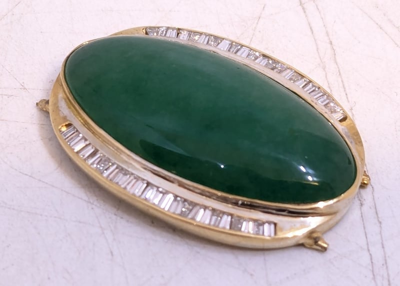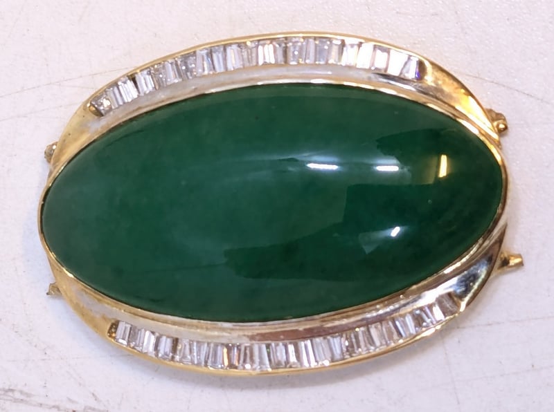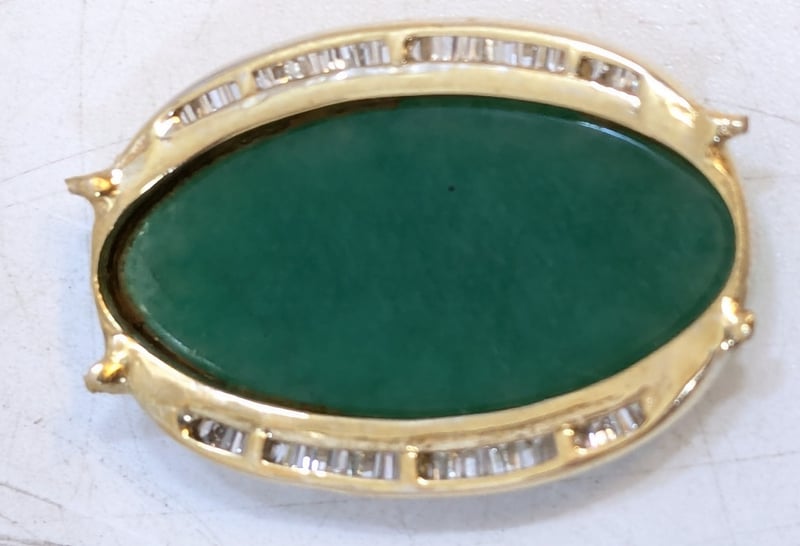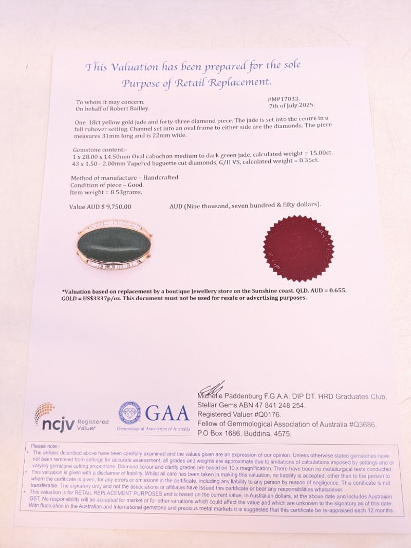 18CT YELLOW GOLD JADE DIAMOND PIECEGemstone Content:1 X 28 X 14.5Mm Oval Cabochun Dark Green Jade, Weight = 15Ct43 X 1.5 - 2Mm Tapered Baguette Cut Diamonds, G/H Vs, Weight = 0.35CtTotal Item Weight: 8.53gCondition: Good - Refer To ImagesThis valuation has been conducted by an independent third-party professional. The valuation amount is an assessment by the issuing valuer and does not reflect the auction value of the item.Any inquiries regarding the valuation should be directed to the issuing valuer (refer to contact details on the certificate), as Lloyds Auctions has no affiliation or influence over the valuation, the valuer, or the stated amount.Insurance Replacement Valuation Amount: $9,750.00585025+30