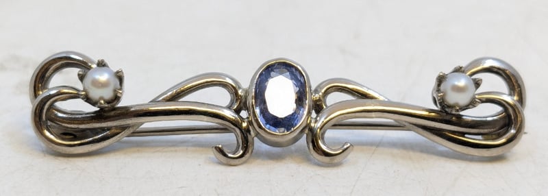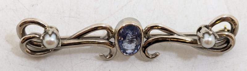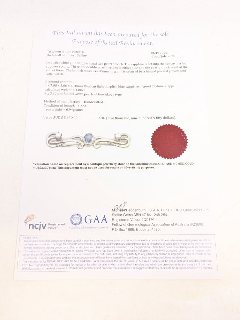 18CT WHITE GOLD SAPPHIRE PEARL BROOCHDiamond Content:1 X 7 X 5 X 3.1Mm Oval Cut Light Purplish Blue Sapphire2 X 3.2Mm Round White Pearls Of Fine Akoya TypeTotal Item Weight: 6.94gCondition: Good - Refer To ImagesThis valuation has been conducted by an independent third-party professional. The valuation amount is an assessment by the issuing valuer and does not reflect the auction value of the item.Any inquiries regarding the valuation should be directed to the issuing valuer (refer to contact details on the certificate), as Lloyds Auctions has no affiliation or influence over the valuation, the valuer, or the stated amount.Insurance Replacement Valuation Amount: $5,950.00585025+46