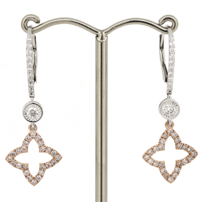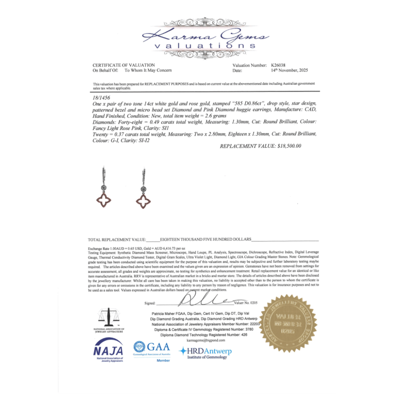 14K WHITE/ROSE GOLD, FANCY PINK DIAMOND AND DIAMOND, DROP EARRINGS. The Centre Features, One Oval Faceted Cut, Light Fancy Yellow, Diamond (0.46Ct, Si1-Si2 Clarity), 4 Claw Set. Flanking The Centre Are, 2 Pear Brilliant Cut, Light Fancy Yellow, Diamonds (0.40Ct Tdw, Si1-Si2 Clarity), 3 Claw Set In Yellow Gold. Decorating The Band Are, 12 Round Brilliant Cut, Diamonds (0.10Ct Tdw, G-H Colour, Si1-Si2 Clarity), Bead Set In White Gold. Ring Size N 1/2. Valuations Provided by an Independent Third-Party Professional Not Directly Associated With Lloyds Auctions at AUD $$18,500.00This valuation has been conducted by an independent third-party professional. The valuation amount is an assessment by the issuing valuer and does not reflect the auction value of the item. Any inquiries regarding the valuation should be directed to the issuing valuer (refer to contact details on the certificate), as Lloyds Auctions has no affiliation or influence over the valuation, the valuer, or the stated amount. Condition: Good - Refer Images 0+55