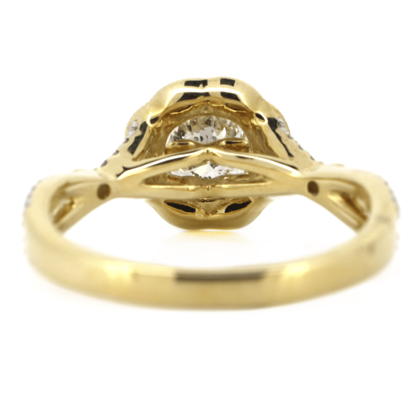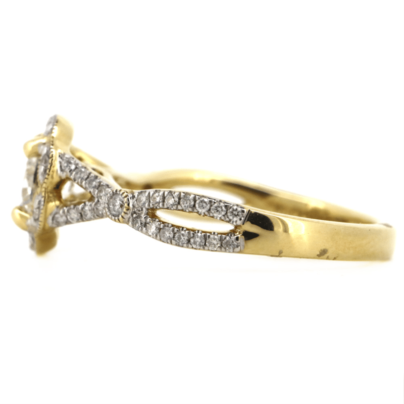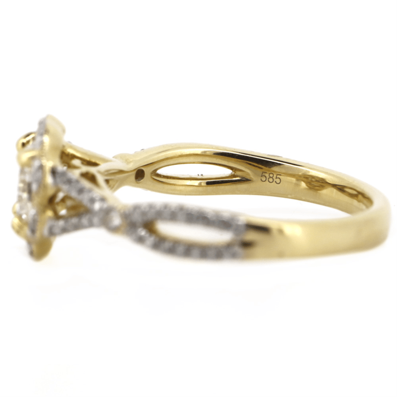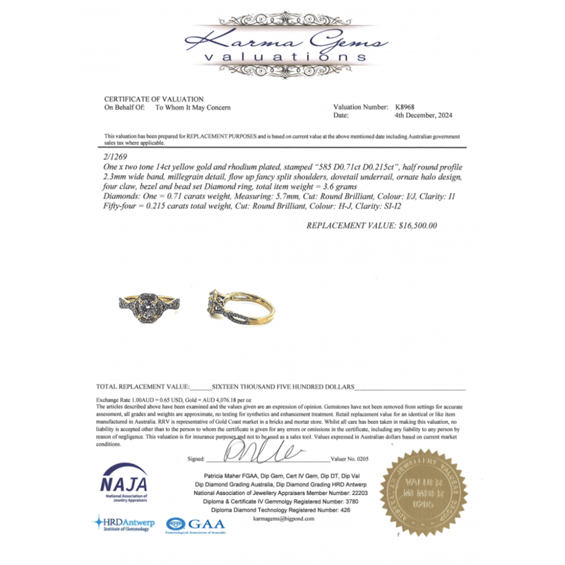 14K YELLOW GOLD AND DIAMOND, ORNATE HALO RING. The Centre Features, One Oval Faceted Cut, Light Fancy Yellow, Diamond (0.46Ct, Si1-Si2 Clarity), 4 Claw Set. Flanking The Centre Are, 2 Pear Brilliant Cut, Light Fancy Yellow, Diamonds (0.40Ct Tdw, Si1-Si2 Clarity), 3 Claw Set In Yellow Gold. Decorating The Band Are, 12 Round Brilliant Cut, Diamonds (0.10Ct Tdw, G-H Colour, Si1-Si2 Clarity), Bead Set In White Gold. Ring Size N 1/2. Valuations Provided by an Independent Third-Party Professional Not Directly Associated With Lloyds Auctions at AUD $$16,500.00This valuation has been conducted by an independent third-party professional. The valuation amount is an assessment by the issuing valuer and does not reflect the auction value of the item. Any inquiries regarding the valuation should be directed to the issuing valuer (refer to contact details on the certificate), as Lloyds Auctions has no affiliation or influence over the valuation, the valuer, or the stated amount. Condition: Good - Refer Images 0+78