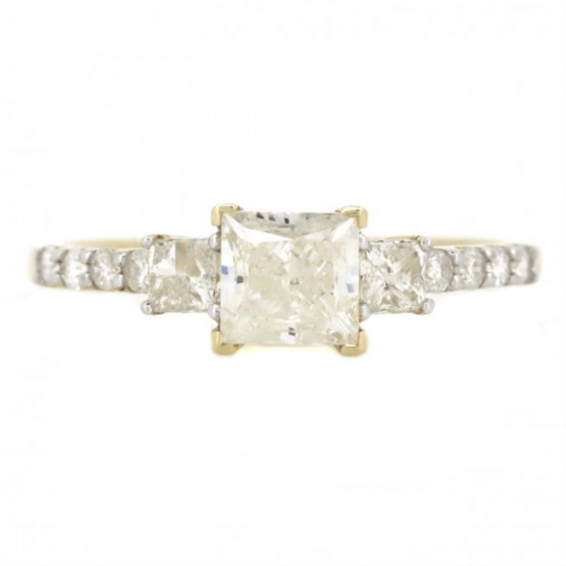 The Centre Features, One Oval Faceted Cut, Light Fancy Yellow, Diamond (0.46Ct, Si1-Si2 Clarity), 4 Claw Set. Flanking The Centre Are, 2 Pear Brilliant Cut, Light Fancy Yellow, Diamonds (0.40Ct Tdw, Si1-Si2 Clarity), 3 Claw Set In Yellow Gold. Decorating The Band Are, 12 Round Brilliant Cut, Diamonds (0.10Ct Tdw, G-H Colour, Si1-Si2 Clarity), Bead Set In White Gold. Ring Size N 1/2.